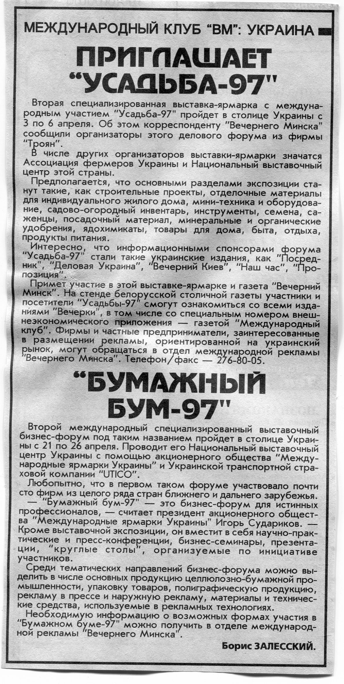 Залесский, Б. Международный клуб "ВМ": Украина / Б. Залесский // Вечерний Минск. - 1997. - 5 февр.