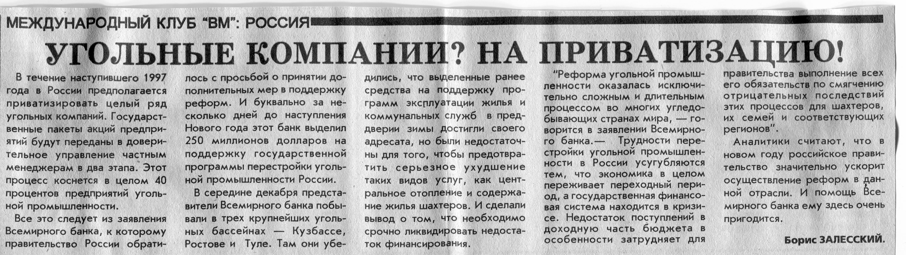 Залесский, Б. Угольные компании? На приватизацию! / Б. Залесский // Вечерний Минск. - 1997. - 23 янв.
