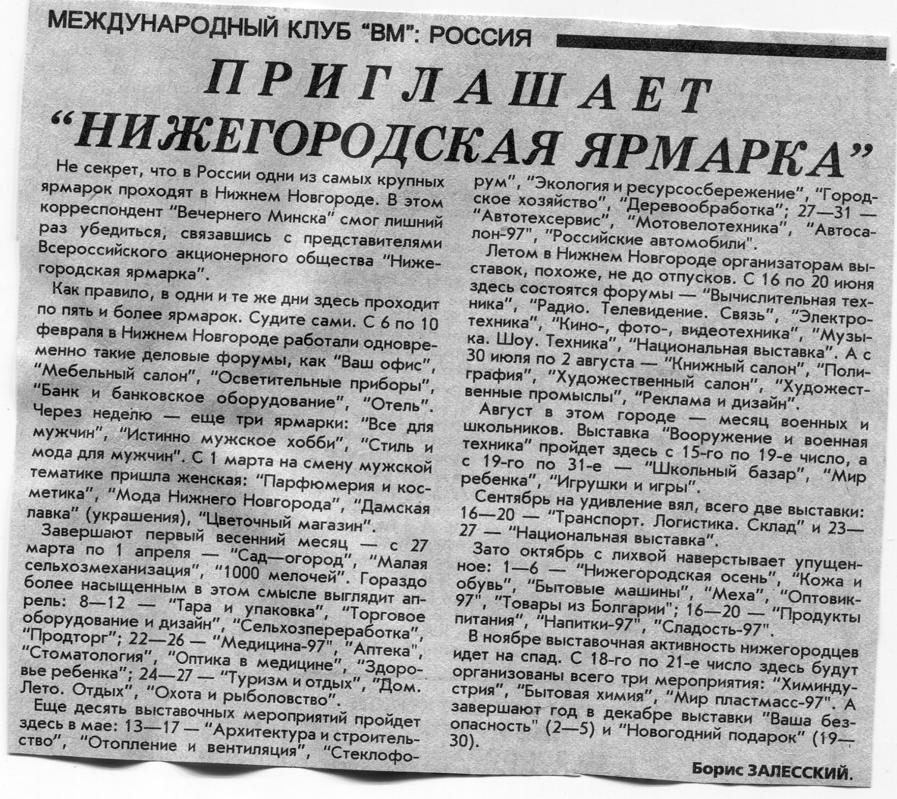 Залесский, Б. Приглашает "Нижегородская ярмарка" / Б. Залесский // Вечерний Минск. - 1997. - 4 мар.