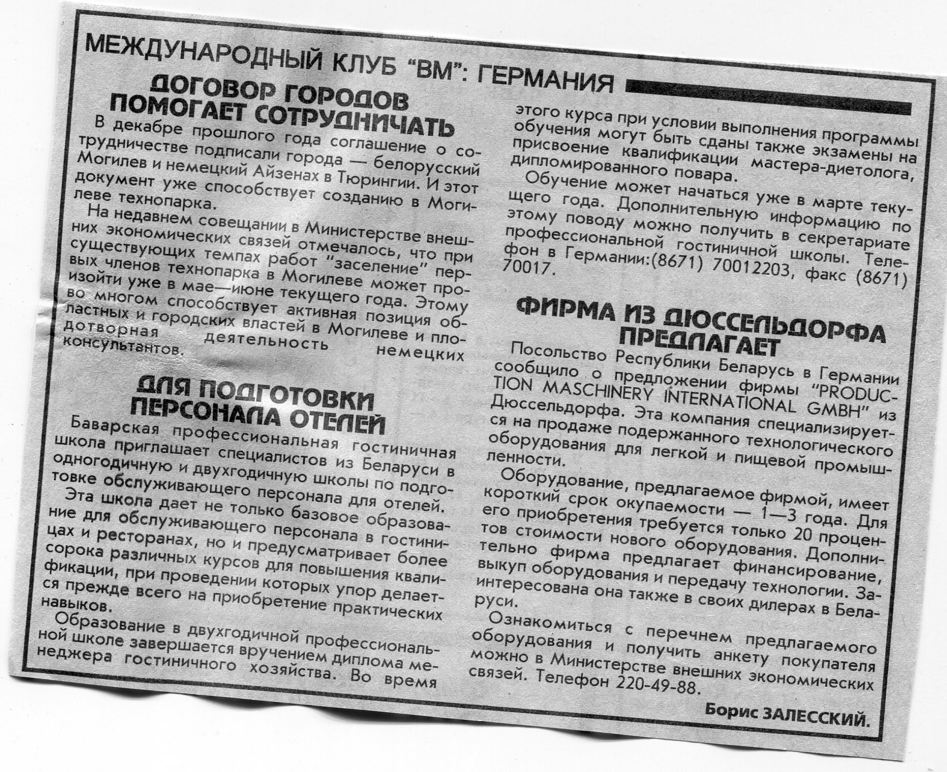 Залесский, Б. Международный клуб "ВМ": Германия / Б. Залесский // Вечерний Минск. - 1997. - 13 февр.