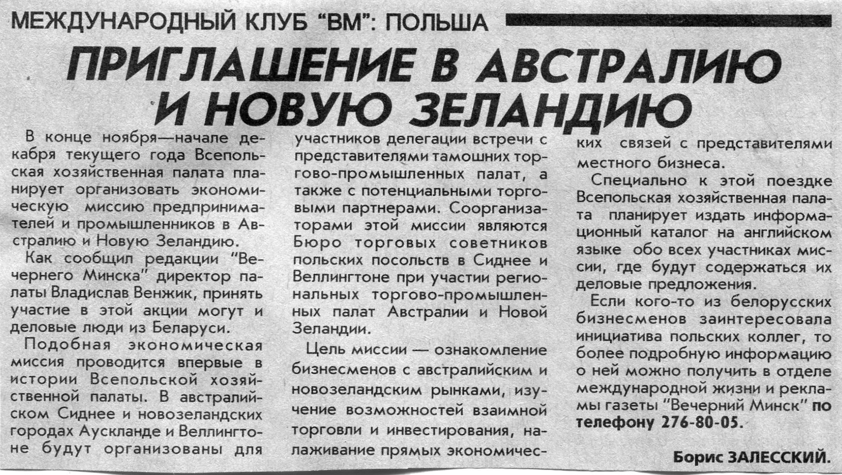 Залесский, Б. Приглашение в Австралию и Новую Зеландию / Б. Залесский // Вечерний Минск. - 1996. - 1 окт.