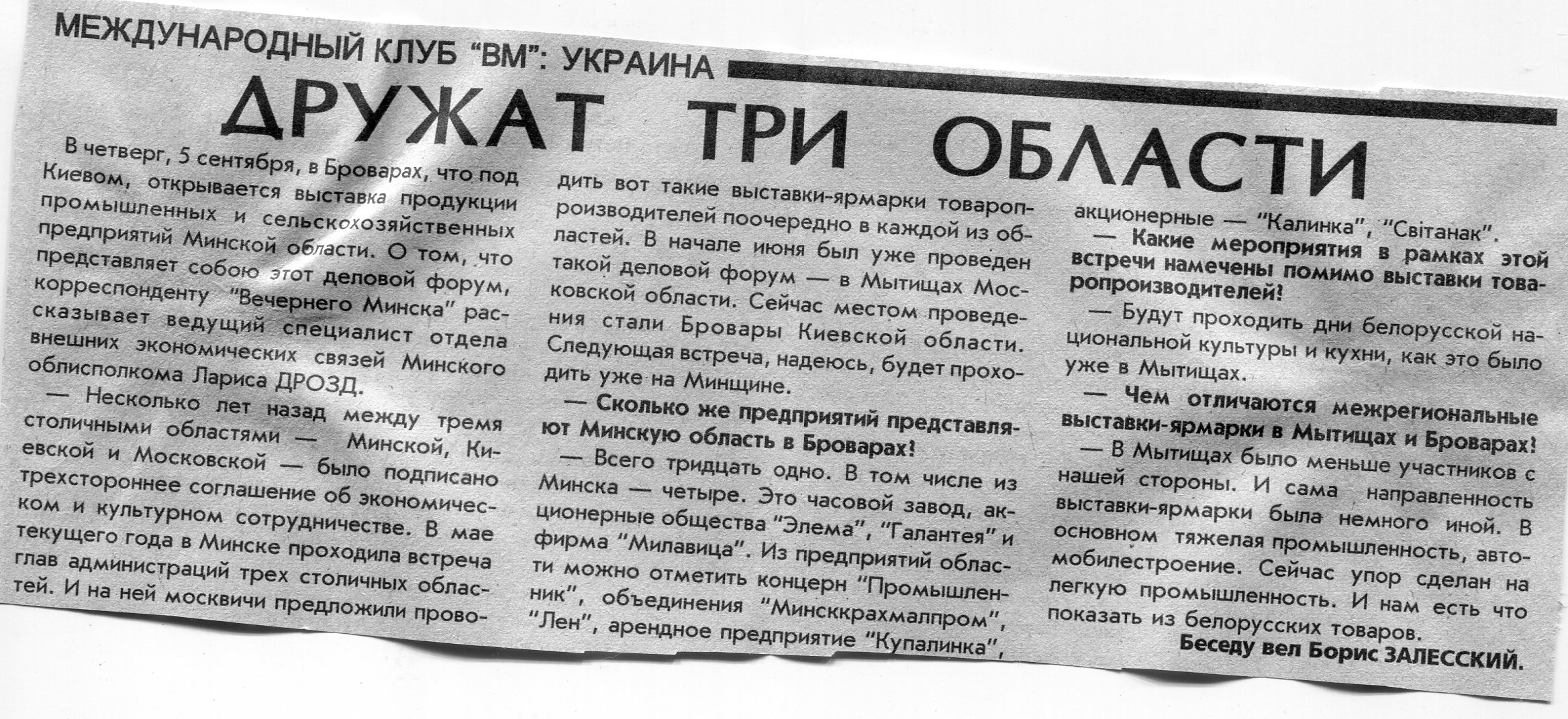 Залесский, Б. Дружат три области / Б. Залесский // Вечерний Минск. - 1996. - 4 сент.