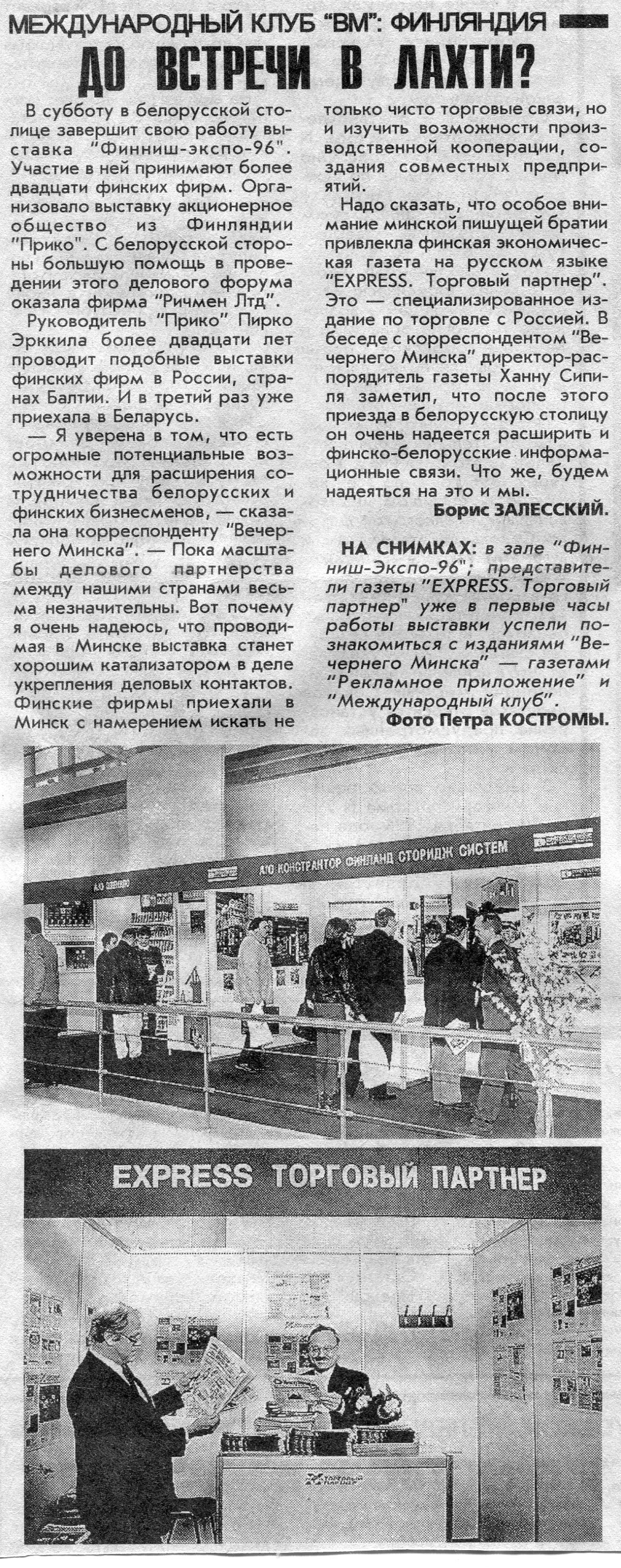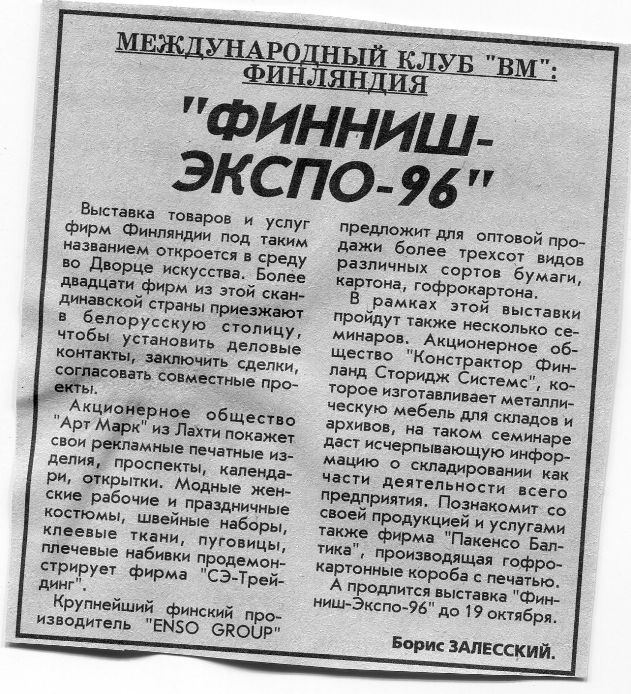 Залесский, Б. "Финниш-Экспо-96" / Б. Залесский // Вечерний Минск. - 1996. - 15 окт.