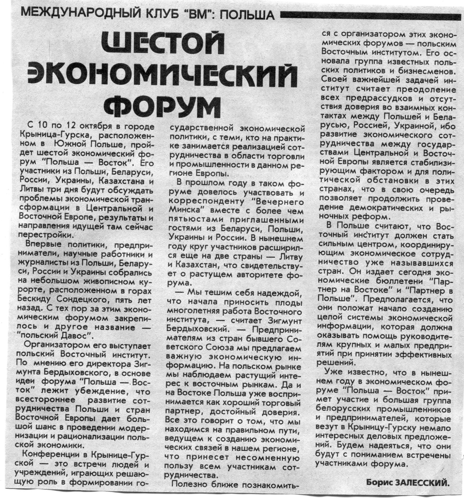 Залесский, Б. Шестой экономический форум / Б. Залесский // Вечерний Минск. - 1996. - 4 окт.