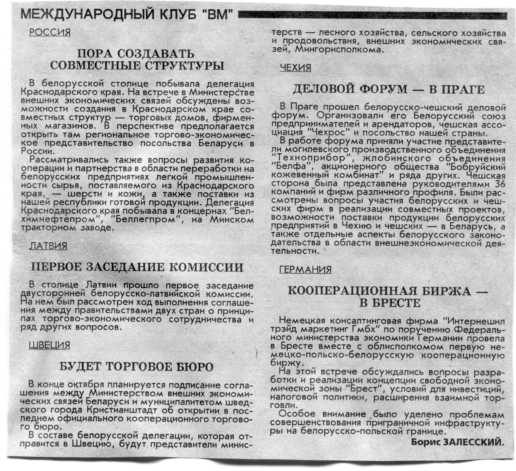 Залесский, Б. Международный клуб "ВМ" / Б. Залесский // Вечерний Минск. - 1996. - 23 окт.