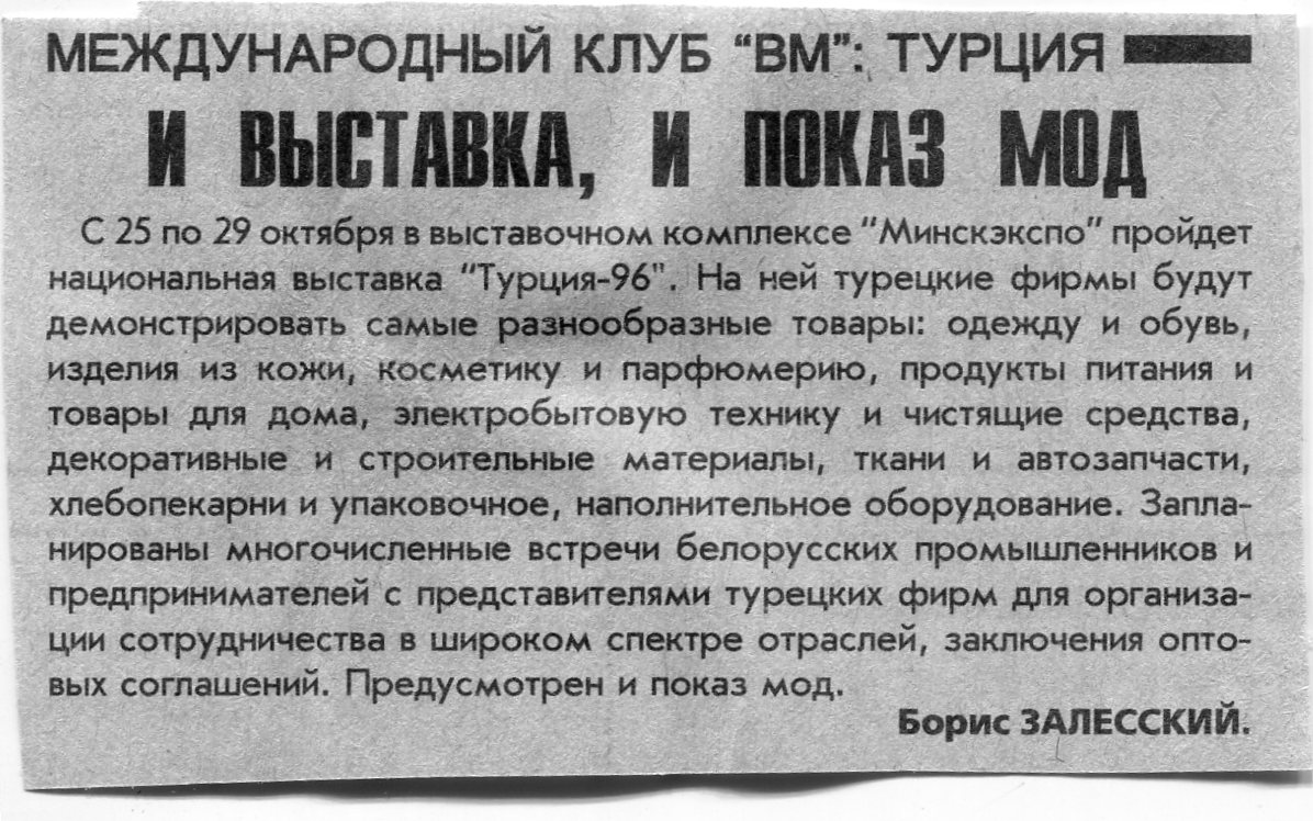 Залесский, Б. И выставка, и показ мод / Б. Залесский // Вечерний Минск. - 1996. - 16 окт.