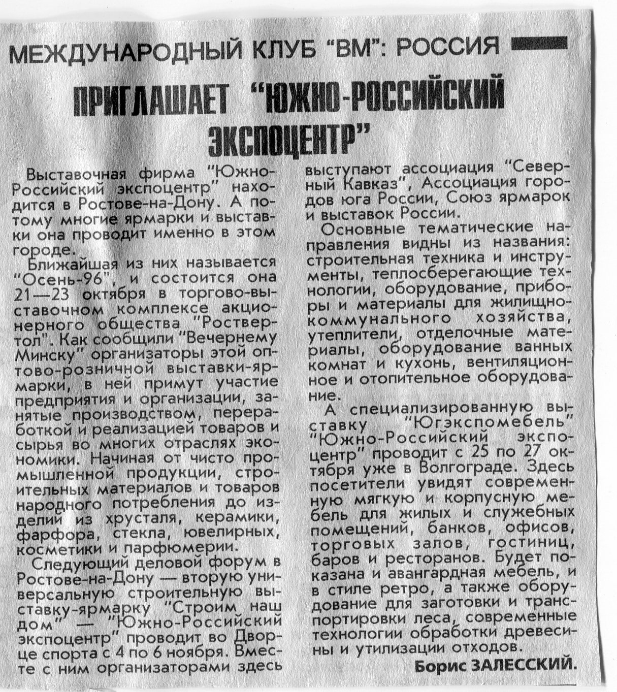 Залесский, Б. Приглашает "Южно-российский экспоцентр" / Б. Залесский // Вечерний Минск. - 1996. - 18 окт.