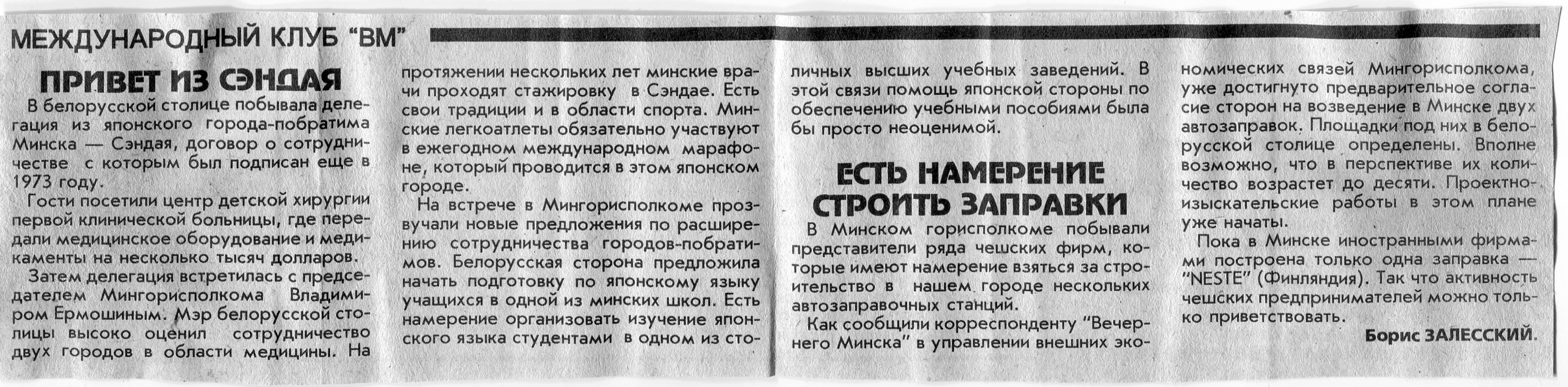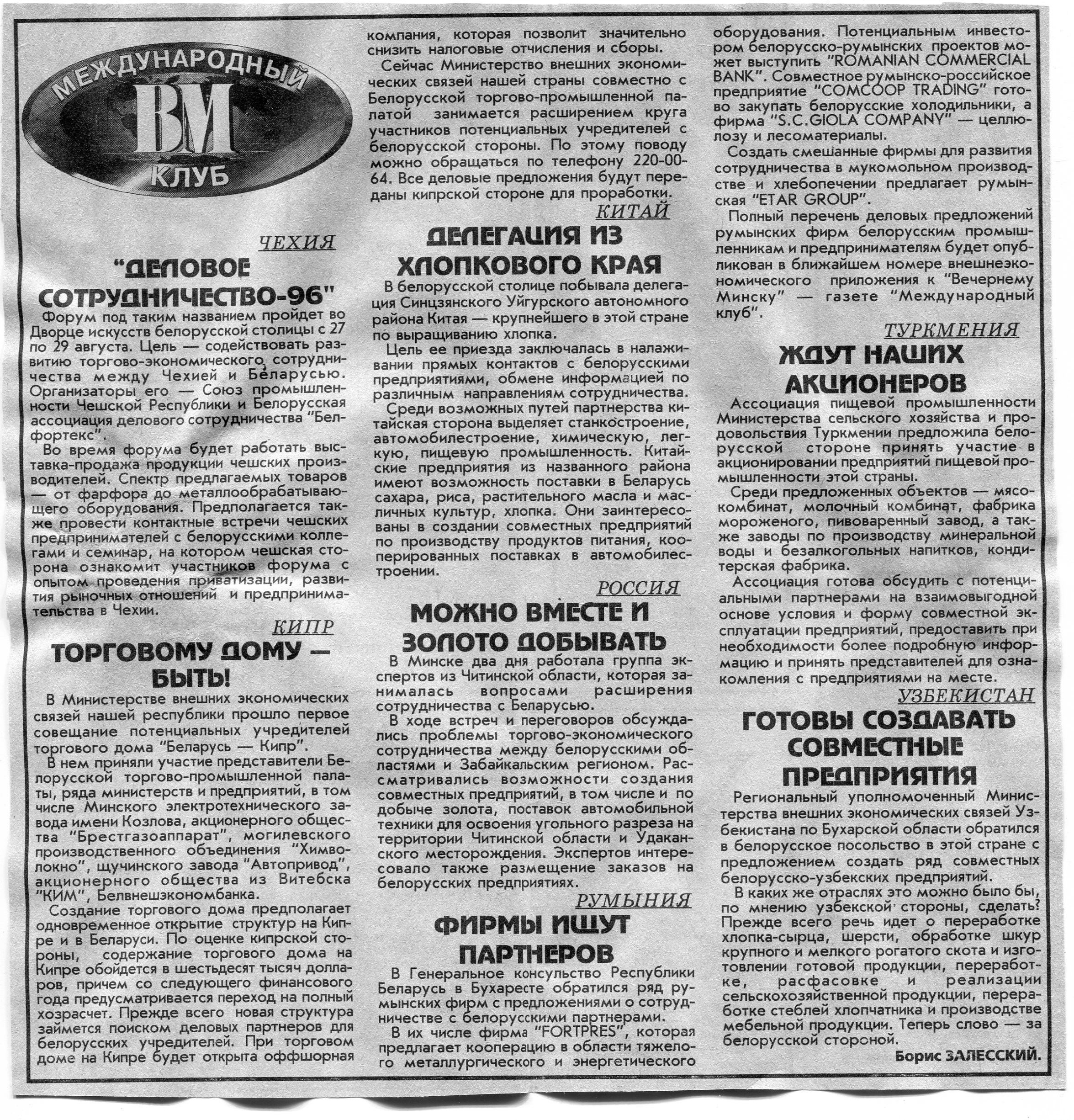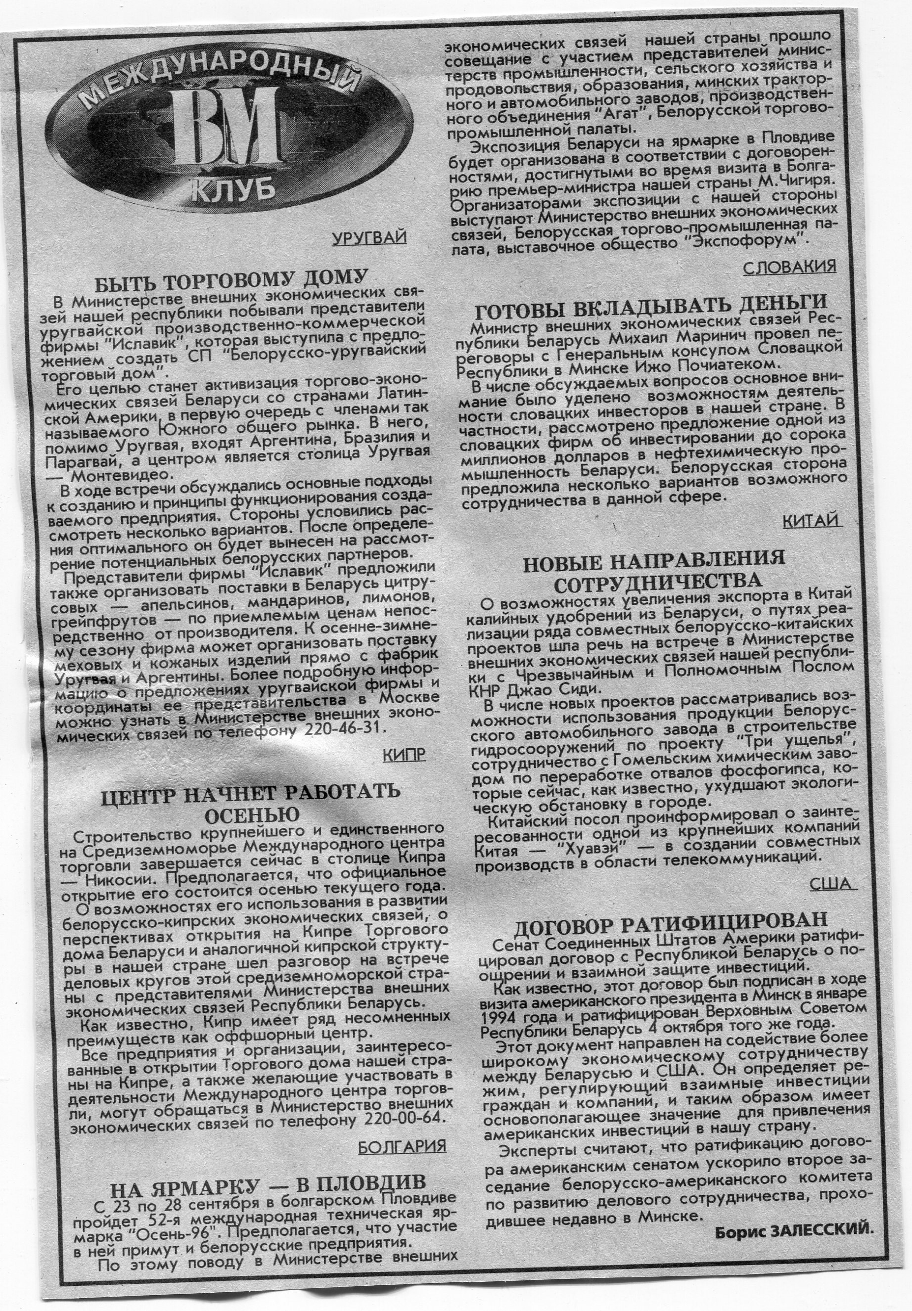 Залесский, Б. Международный клуб "ВМ" / Б. Залесский // Вечерний Минск. - 1996. - 6 авг.