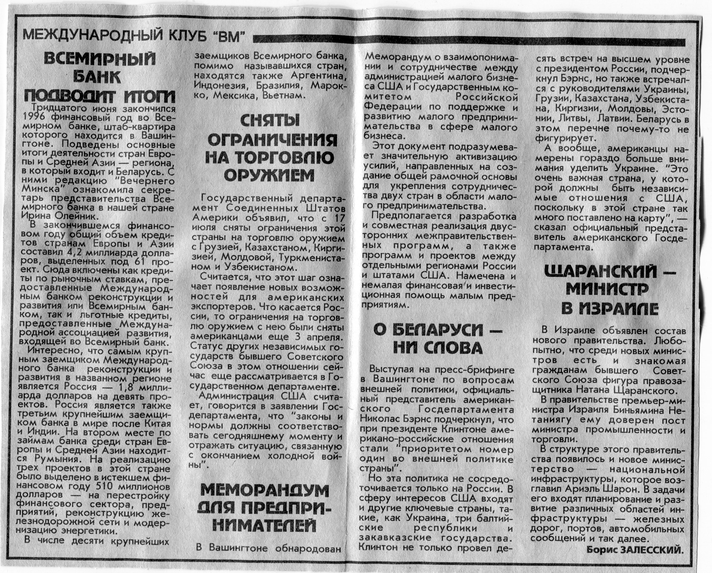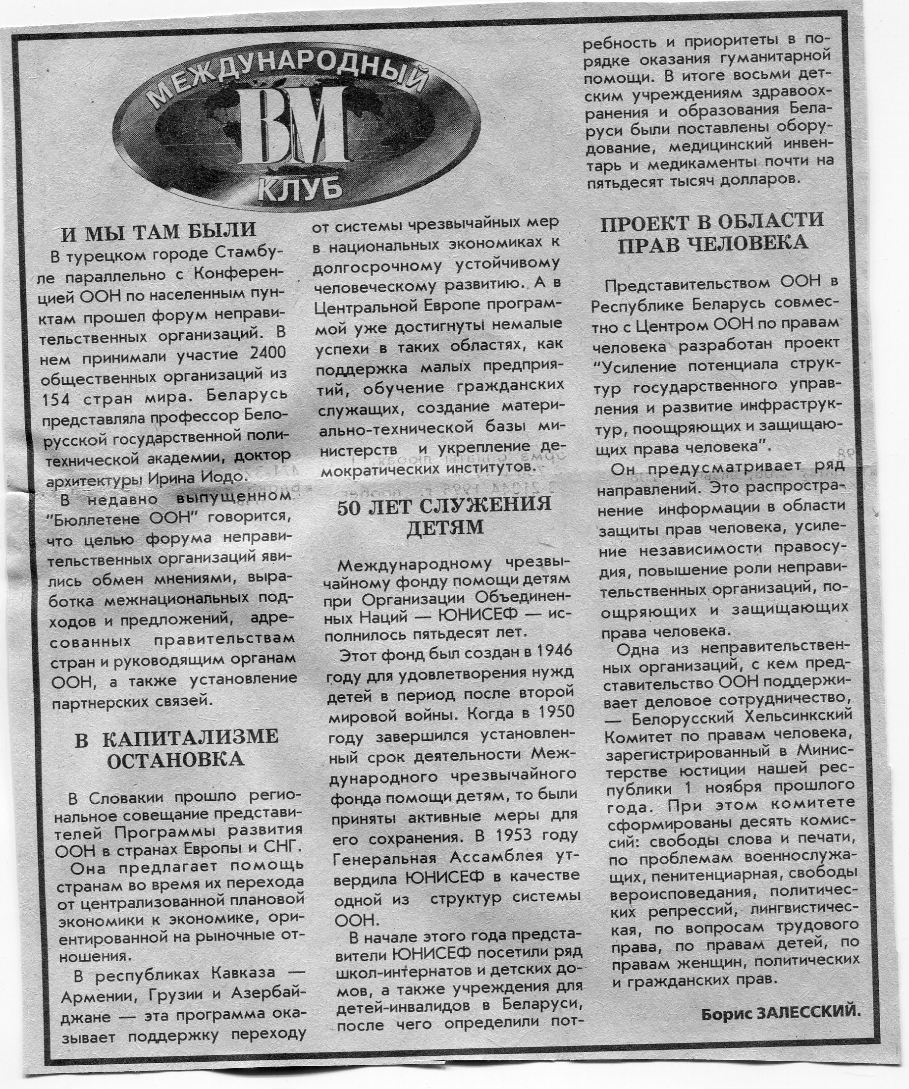 Залесский, Б. Международный клуб "ВМ" / Б. Залесский // Вечерний Минск. - 1996. - 8 июл.