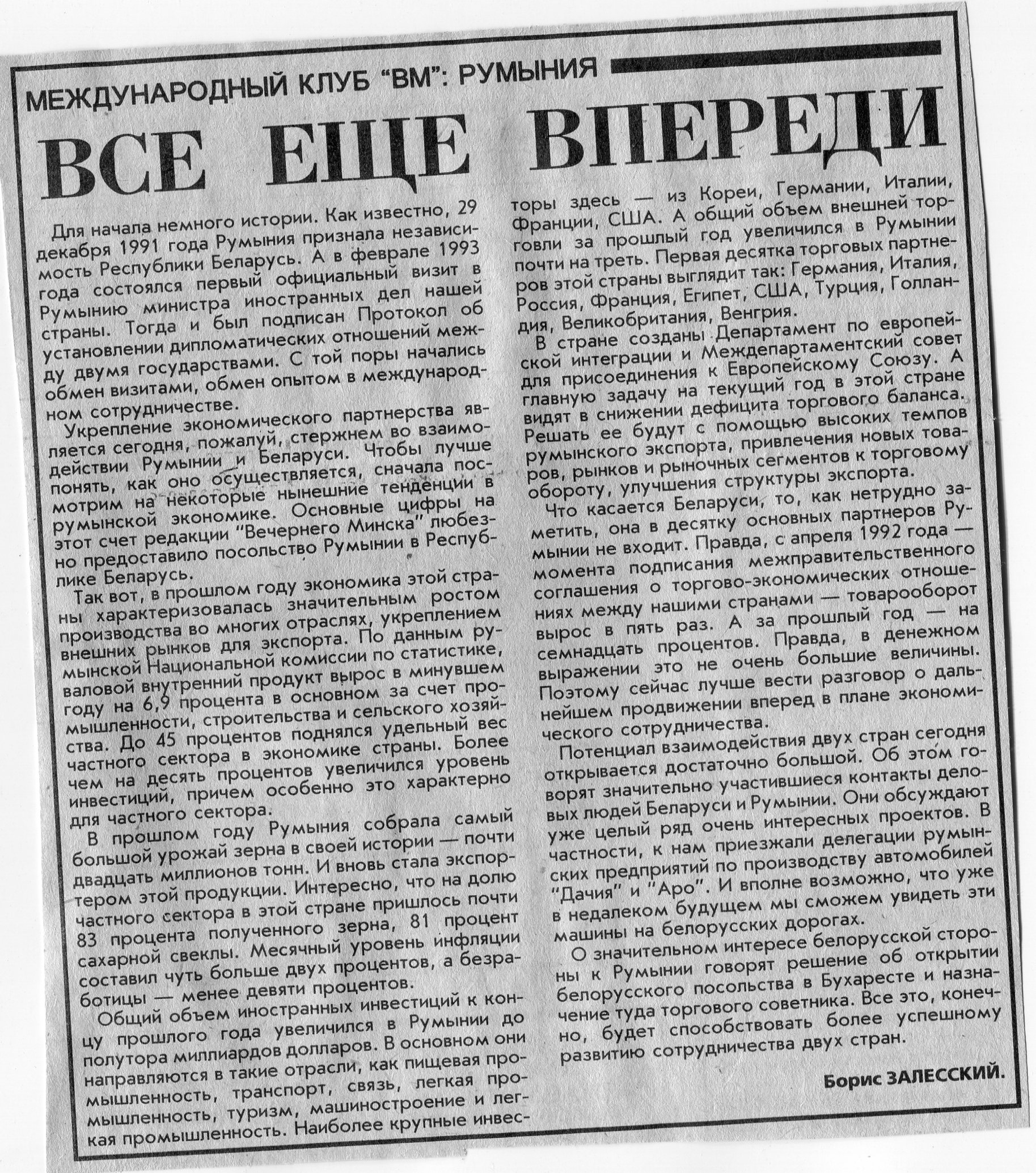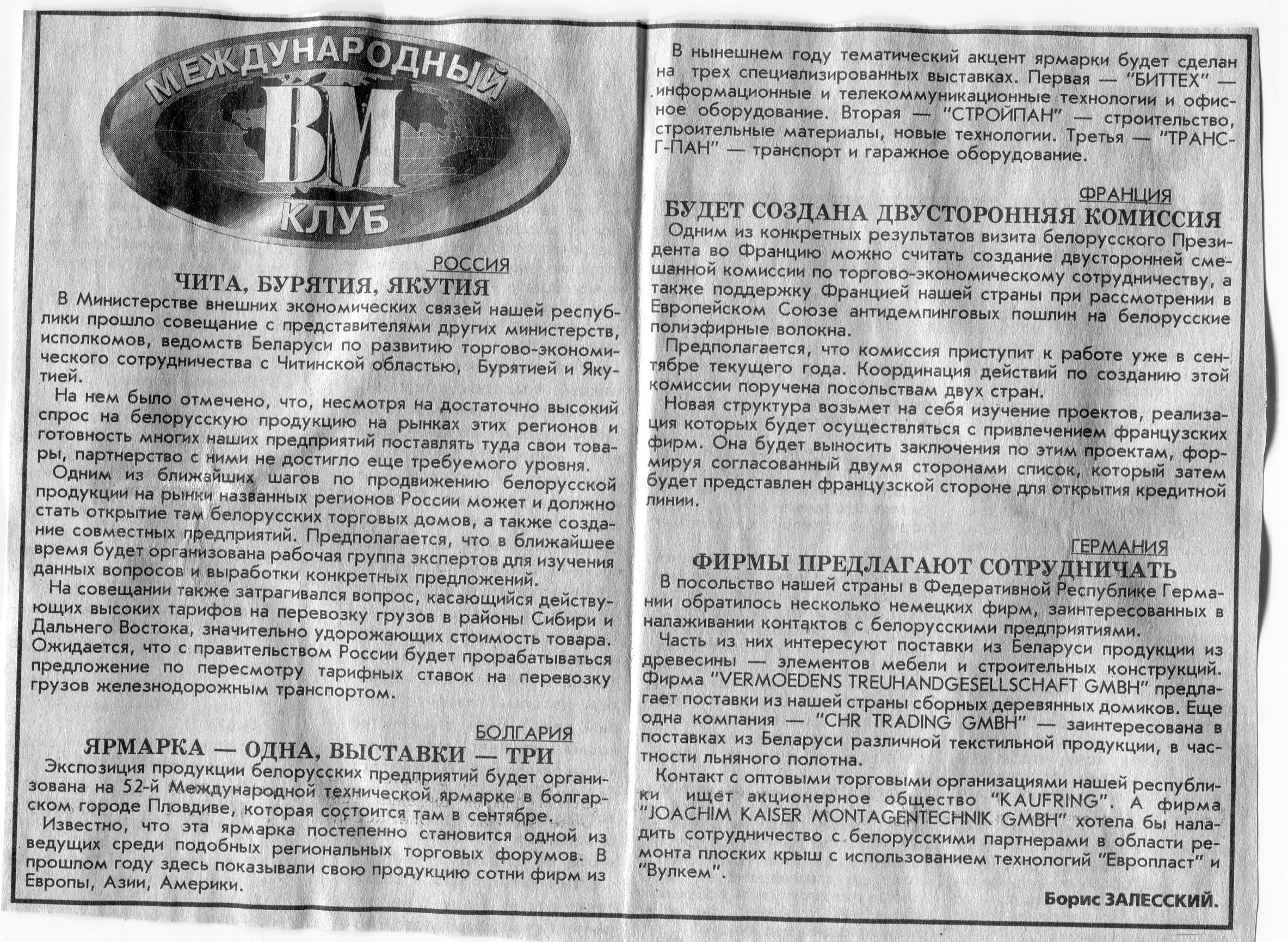 Залесский, Б. Международный клуб "ВМ" / Б. Залесский // Вечерний Минск. - 1996. - 18 июл.