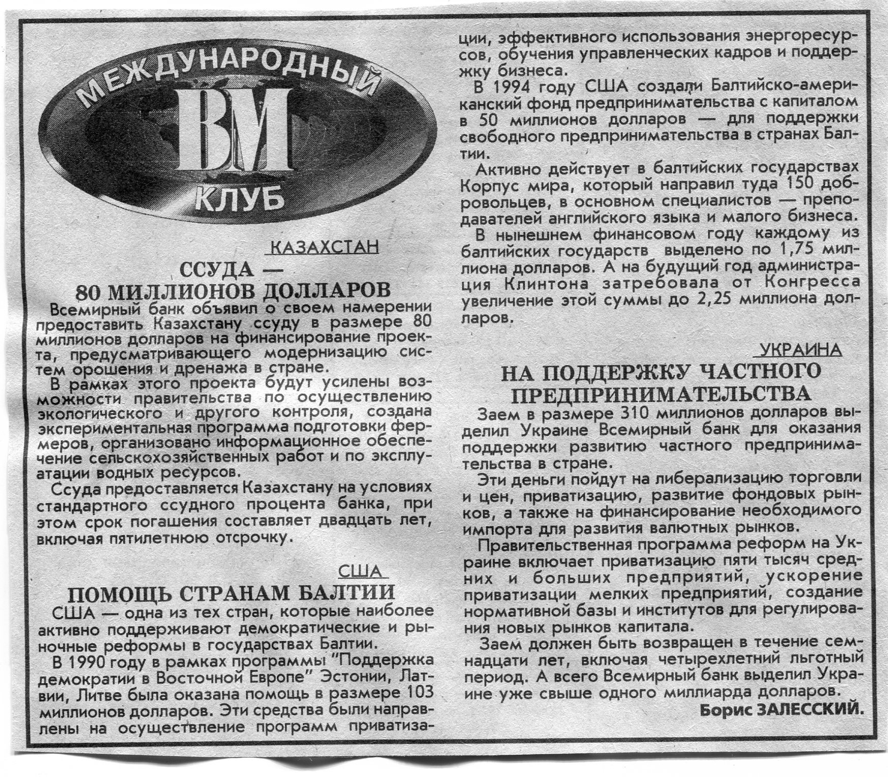 Залесский, Б. Международный клуб "ВМ" / Б. Залесский // Вечерний Минск. - 1996. - 29 июл.