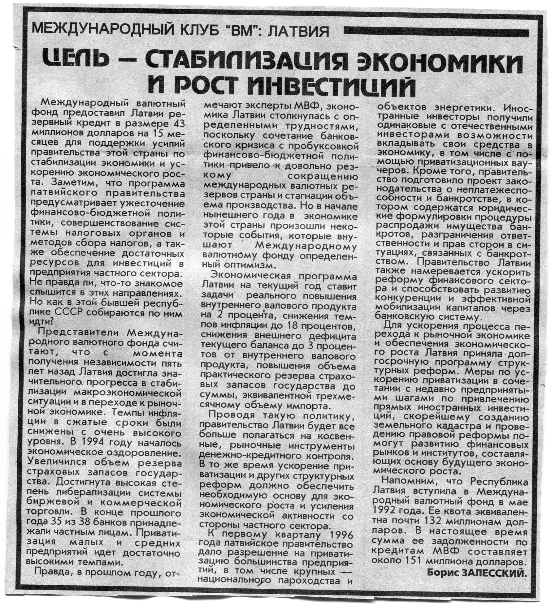 Залесский, Б. Цель - стабилизацимя экономики и рост инвестиций / Б. Залесский // Вечерний Минск. - 1996. - 3 июл.