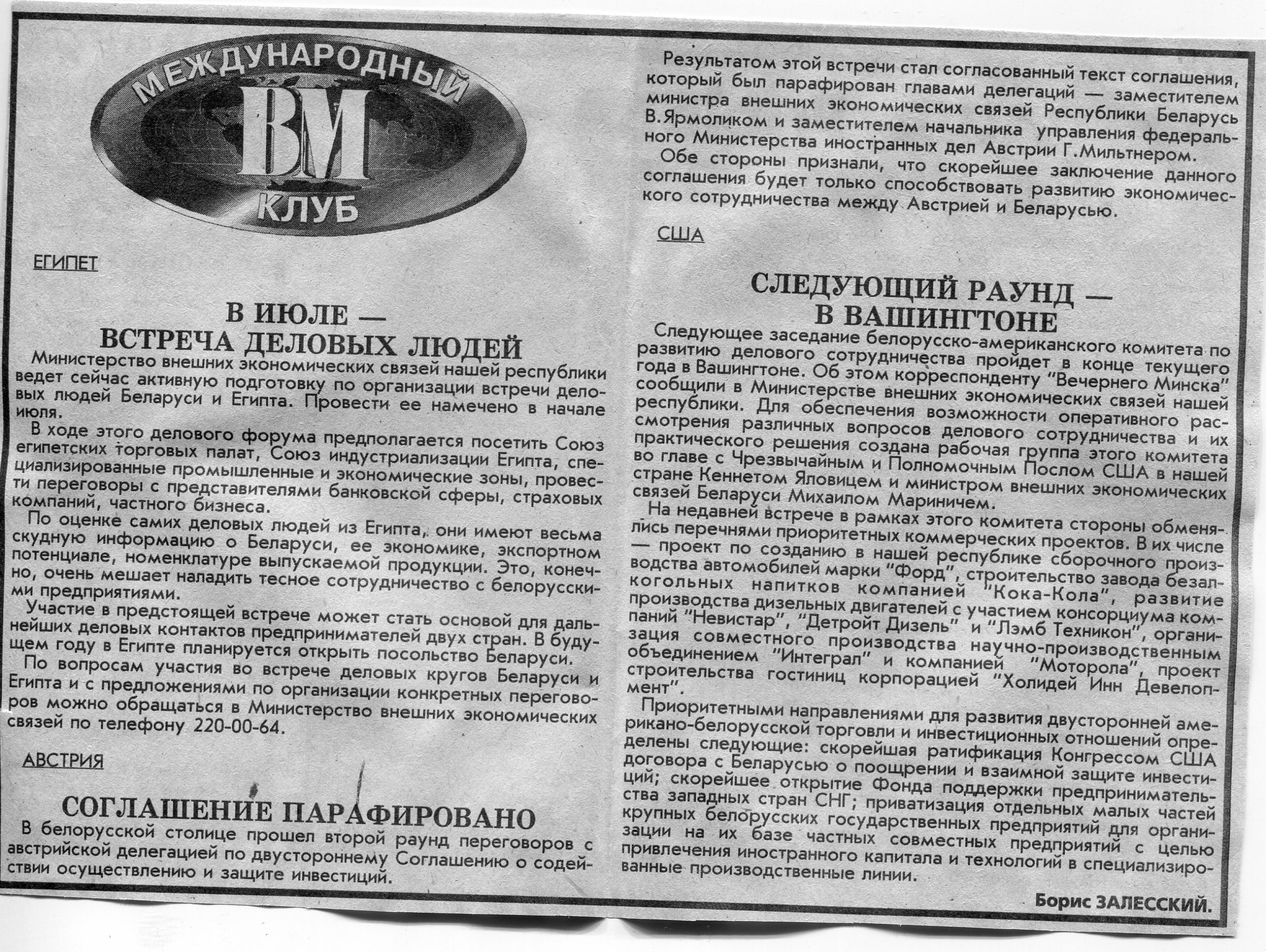 Залесский, Б. Международный клуб "ВМ" / Б. Залесский // Вечерний Минск. - 1996. - 20 июн.
