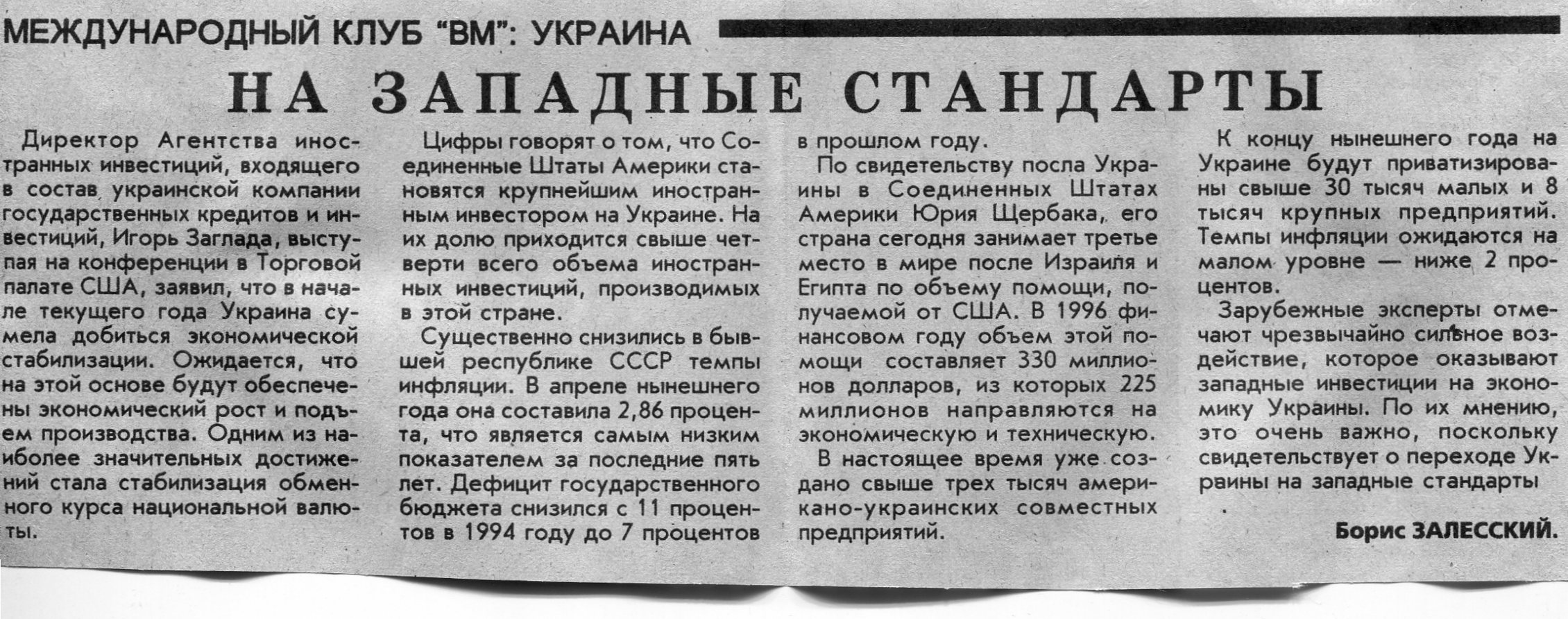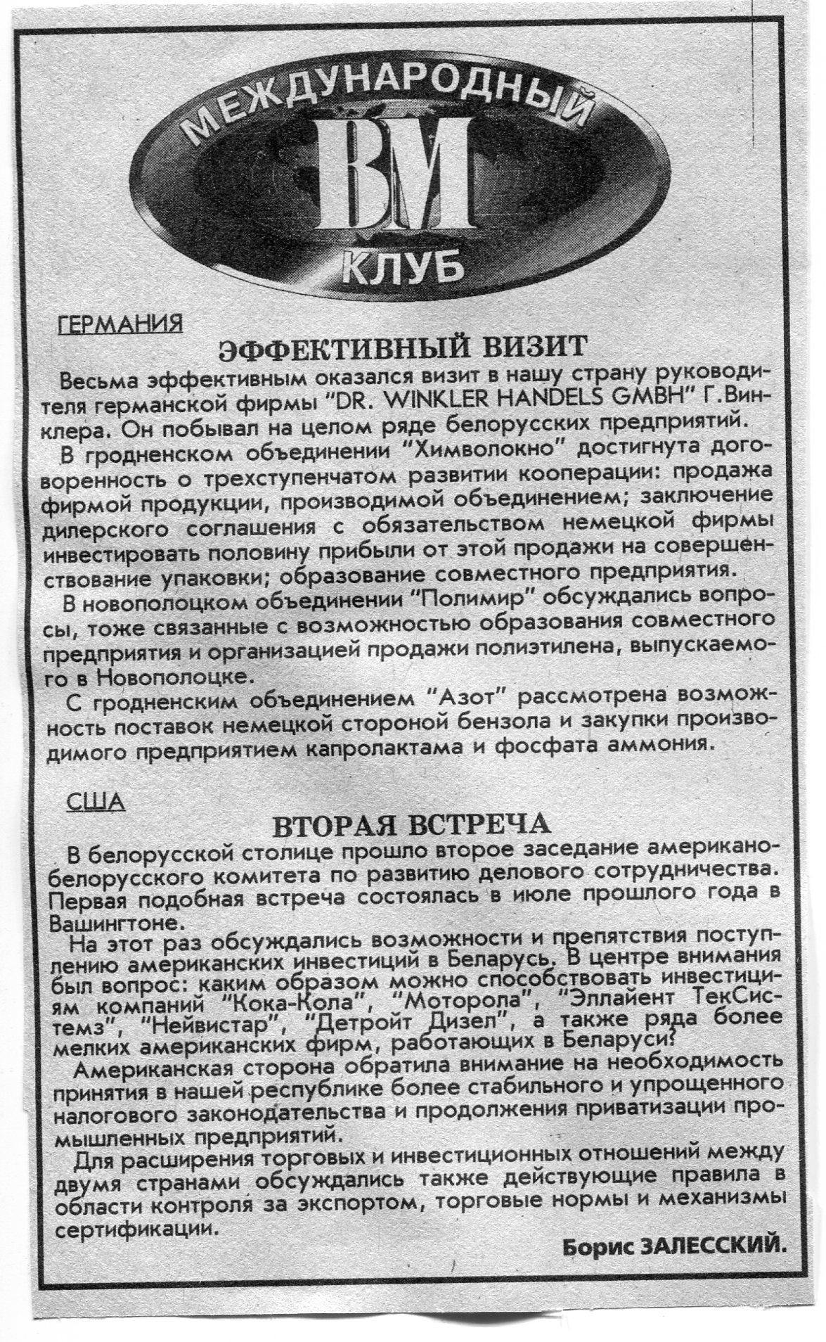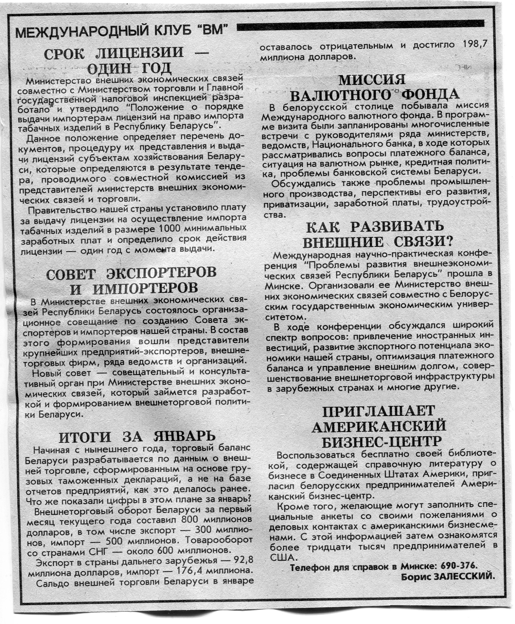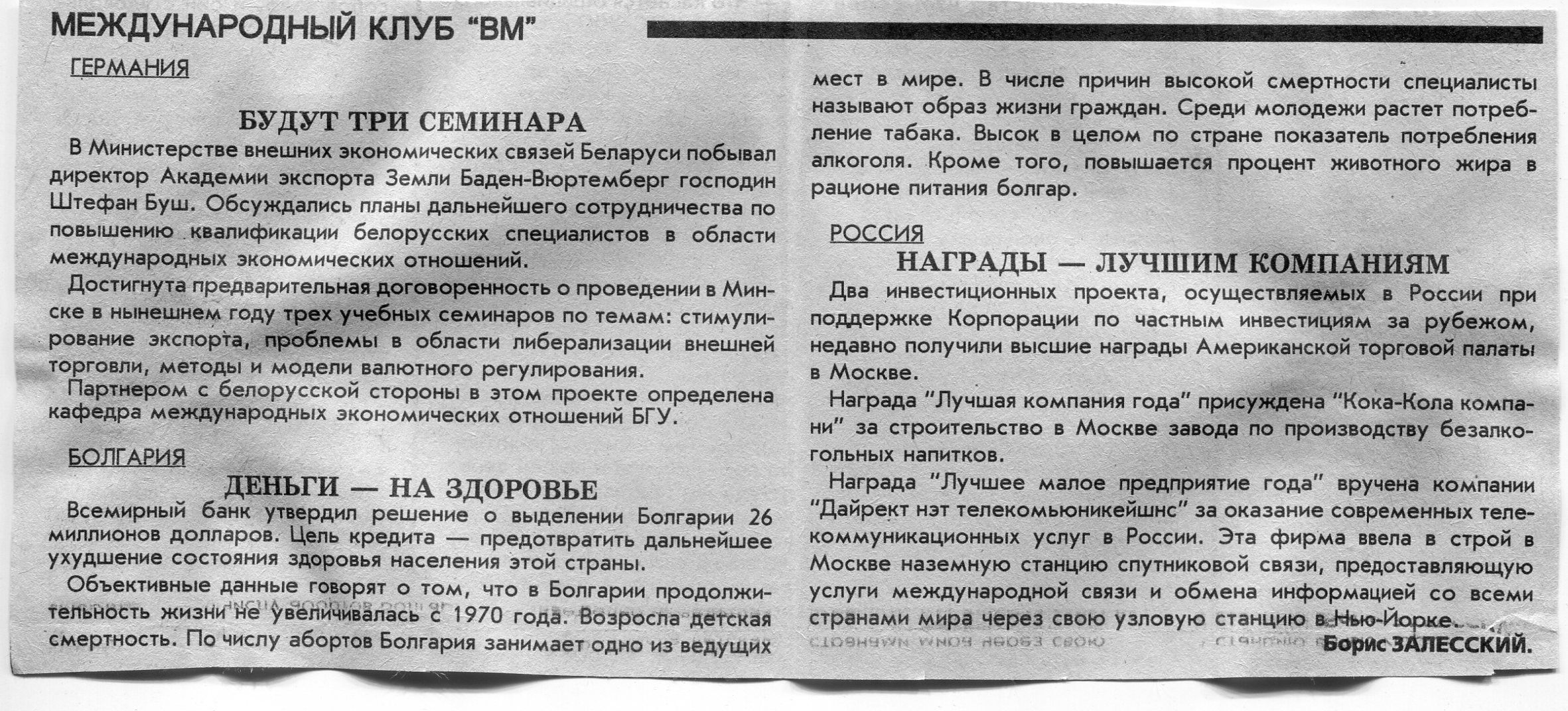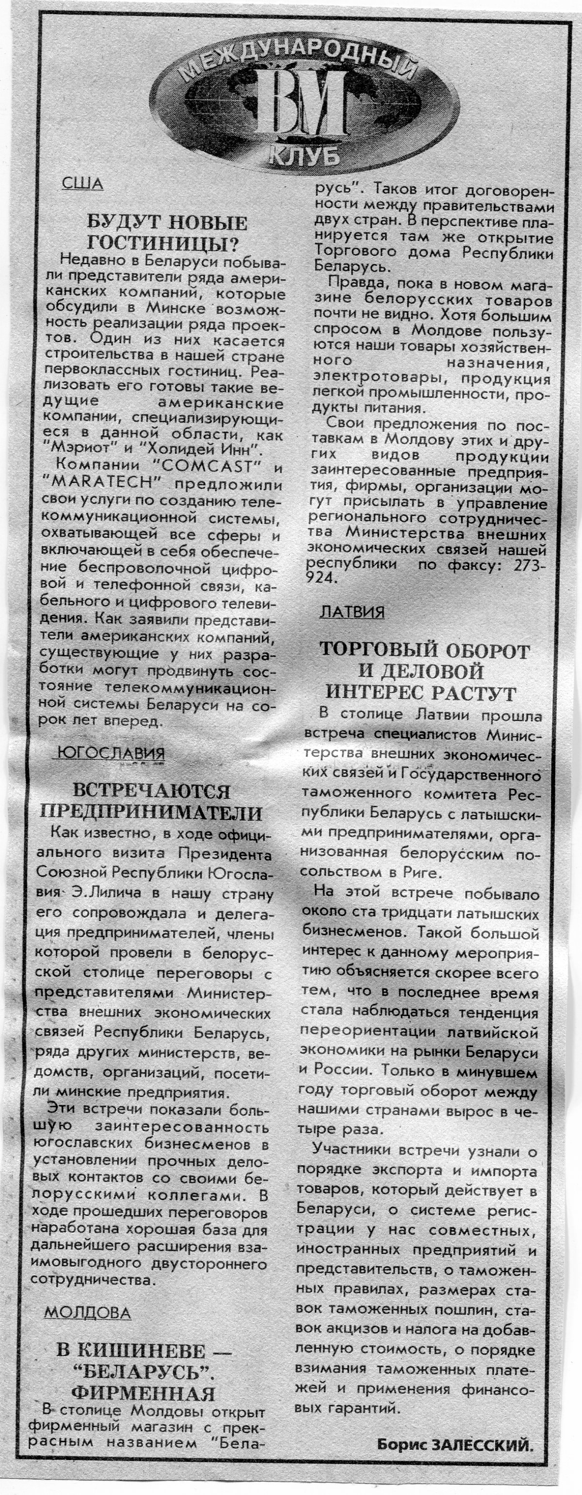 Залесский, Б. Международный клуб "ВМ" / Б. Залесский // Вечерний Минск. - 1996. - 14 мая.