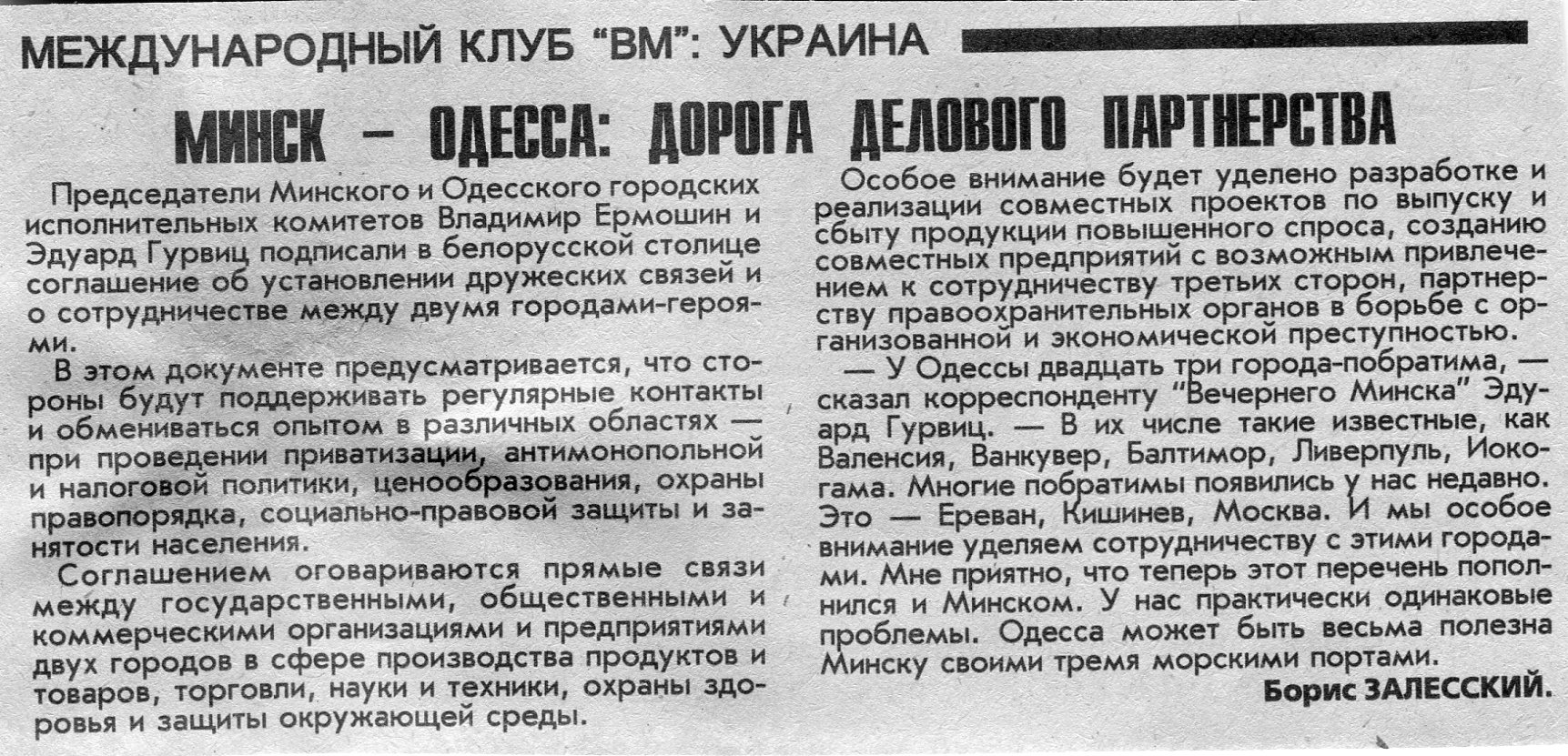 Залесский, Б. Минск - Одесса: дорога делового партнерства / Б. Залесский // Вечерний Минск. - 1996. - 8 мая.