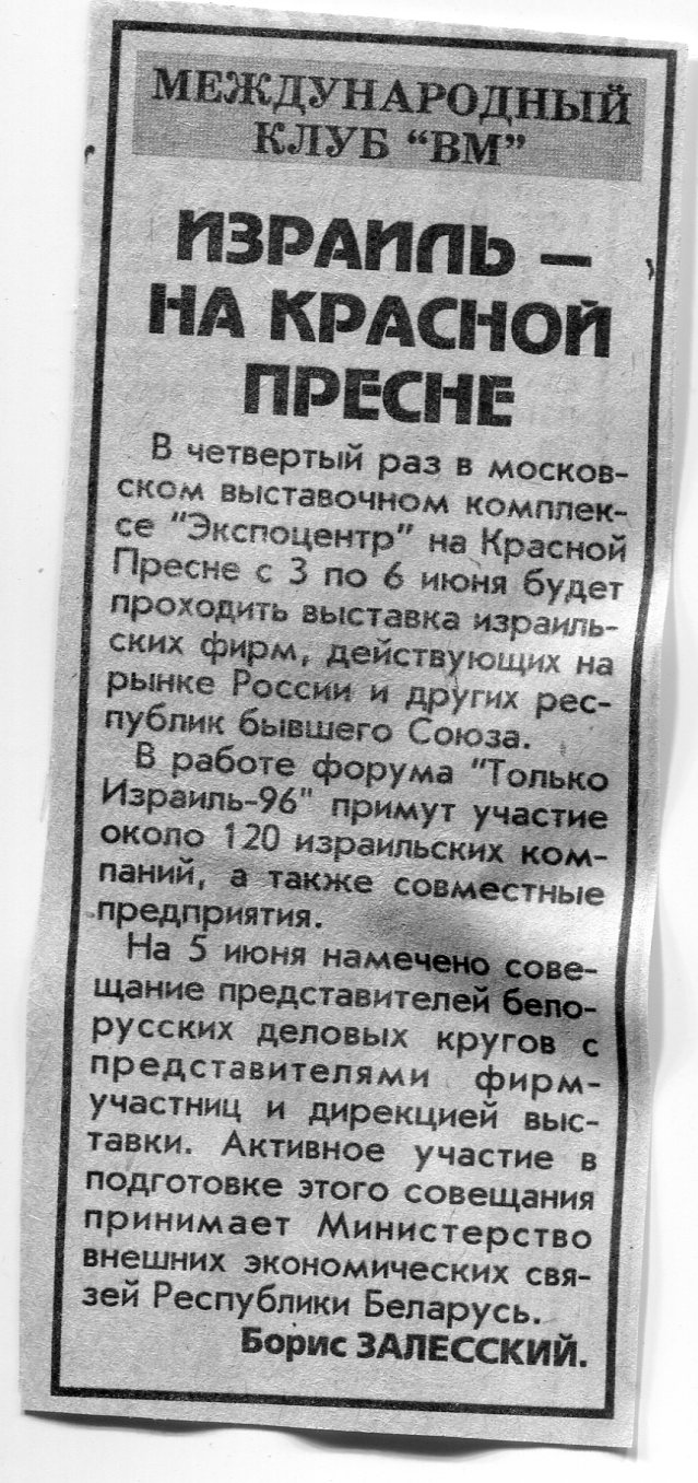 Залесский, Б. Израиль - на Красной Пресне / Б. Залесский // Вечерний Минск. - 1996. - 31 мая.