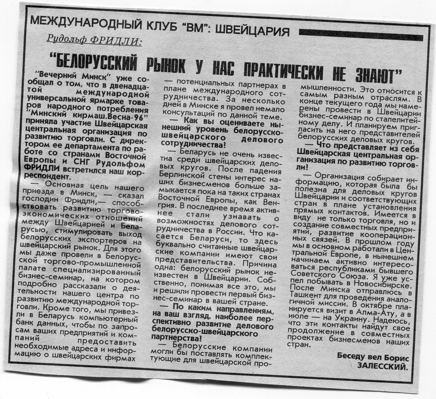 Залесский, Б. Рудольф Фридли: "Белорусский рынок у нас практически не знают" / Б. Залесский // Вечерний Минск. - 1996. - 29 апр.