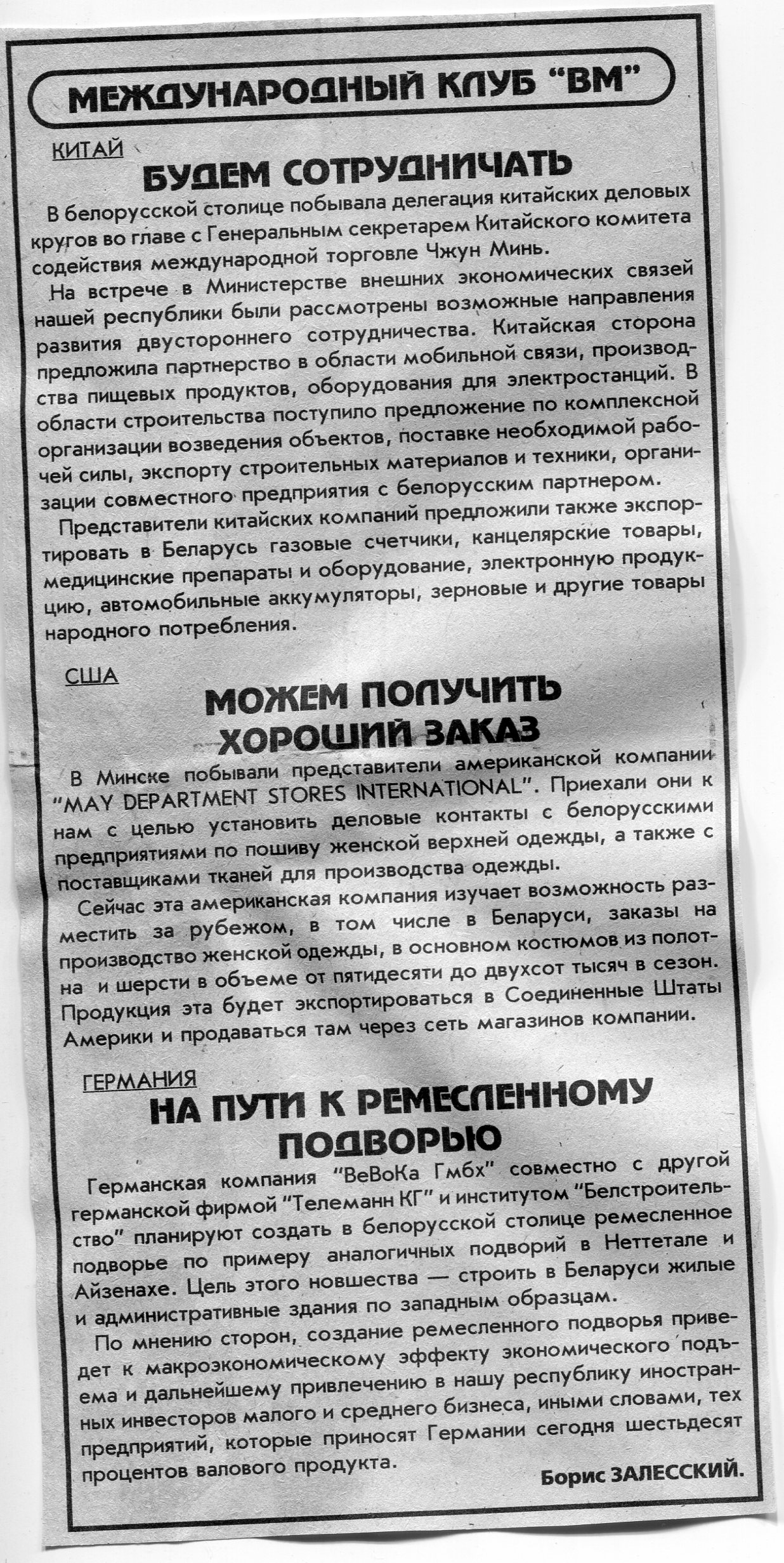 Залесский, Б. Международный клуб "ВМ" / Б. Залесский // Вечерний Минск. - 1996. - 6 мая.