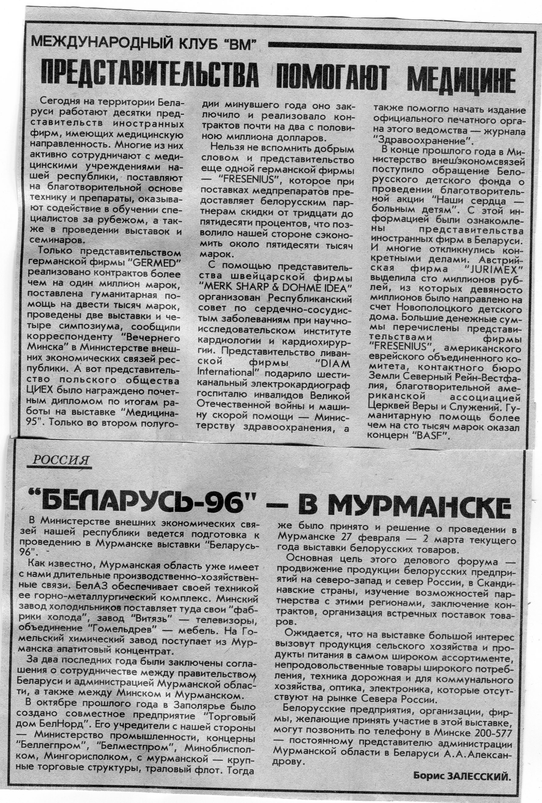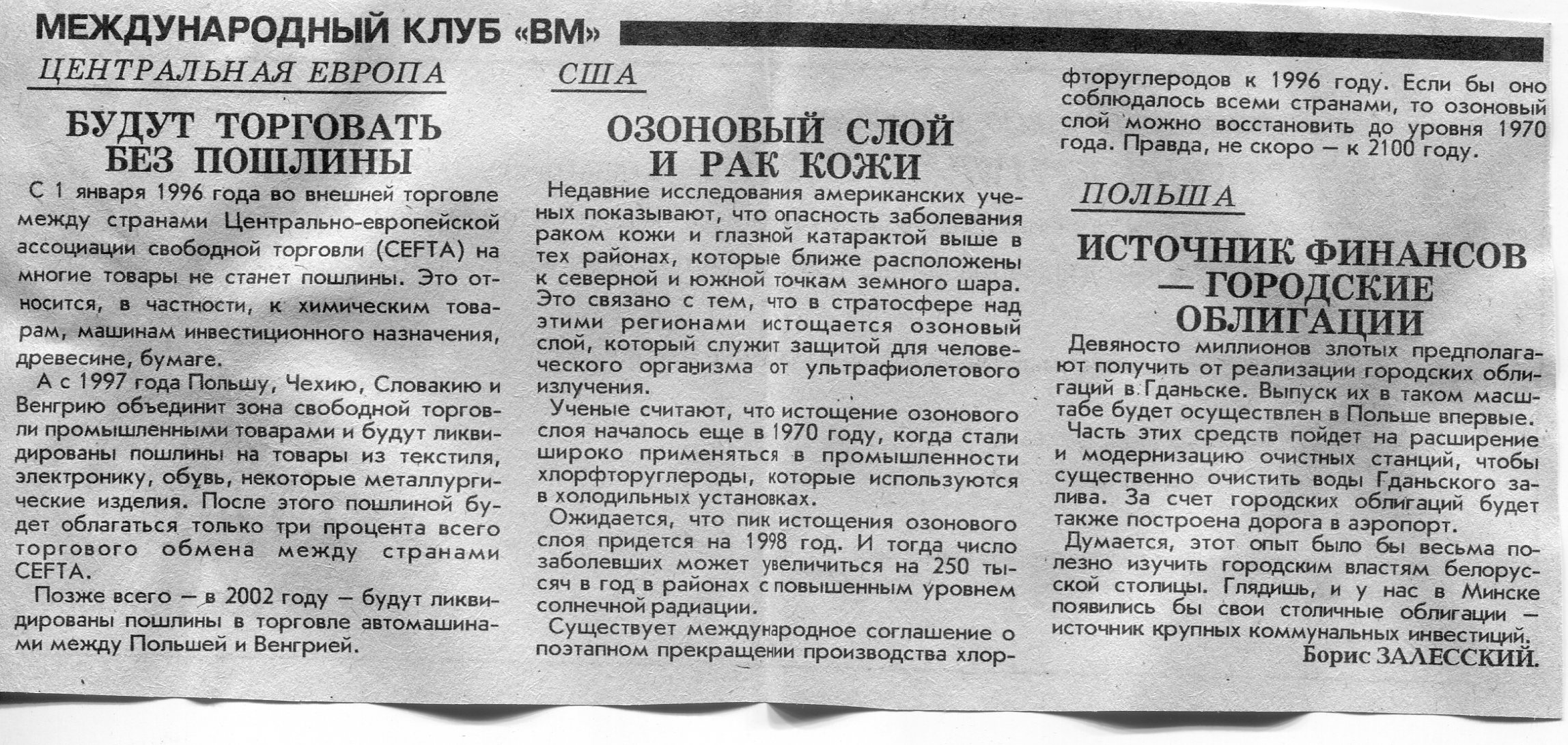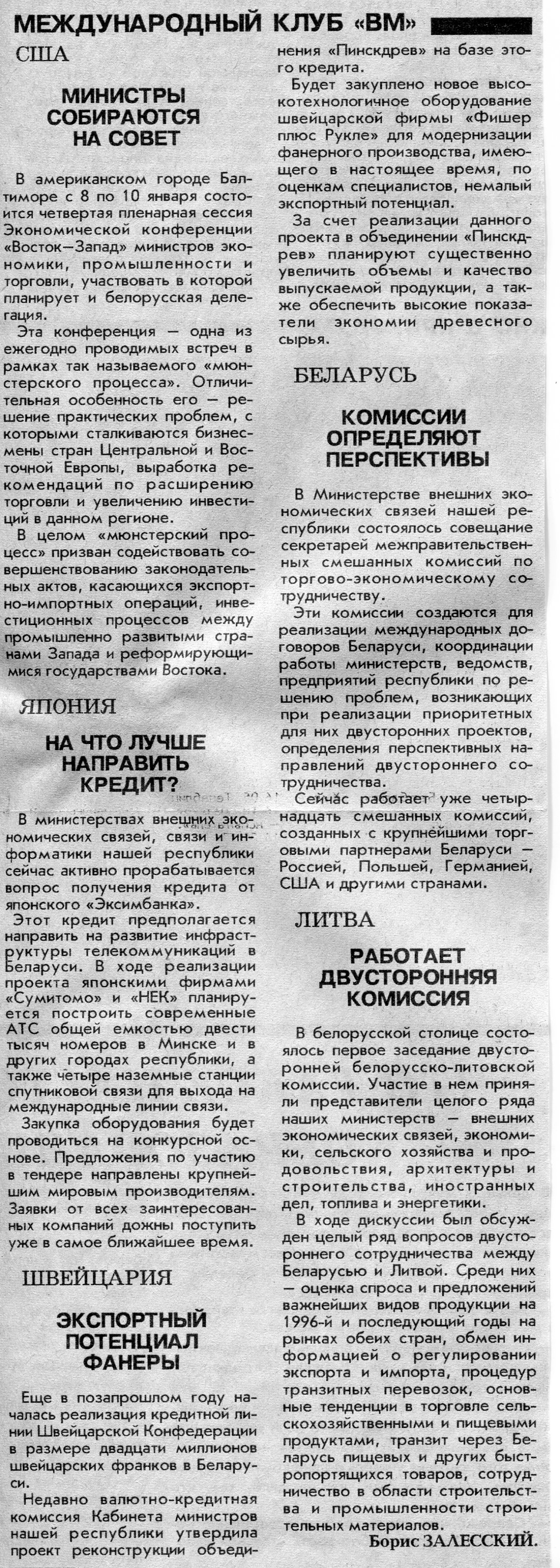 Залесский, Б. Международный клуб "ВМ" / Б. Залесский // Вечерний Минск. - 1996. - 10 янв.
