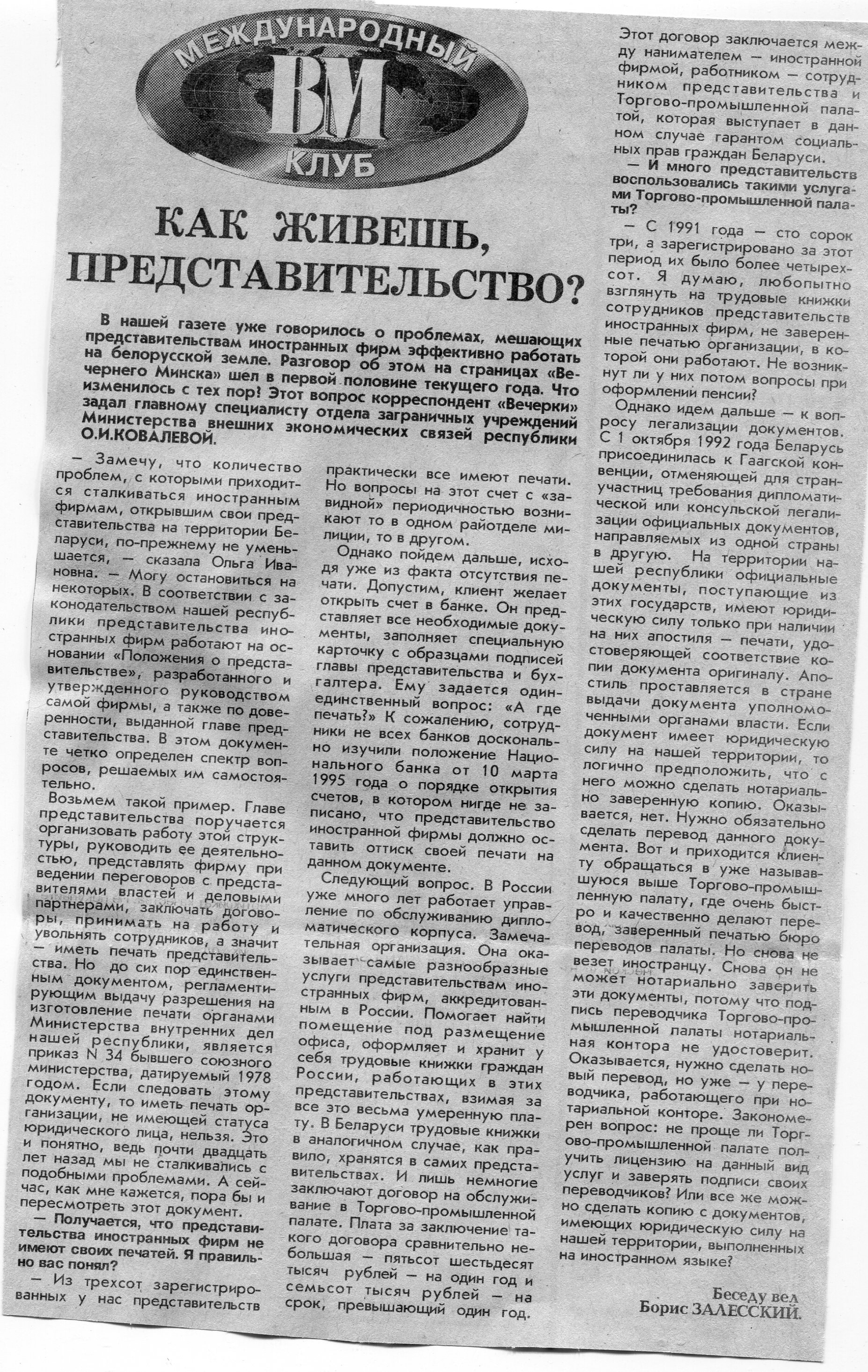 Залесский, Б. Как живешь, представительство? / Б. Залесский // Вечерний Минск. - 1995. - 26 дек.