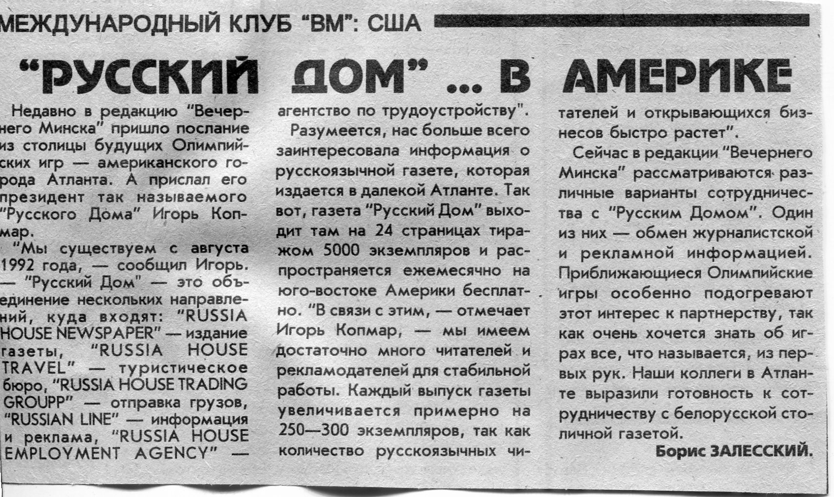 Залесский, Б. "Русский дом" ... в Америке / Б. Залесский // Вечерний Минск. - 1996. - 7 февр.