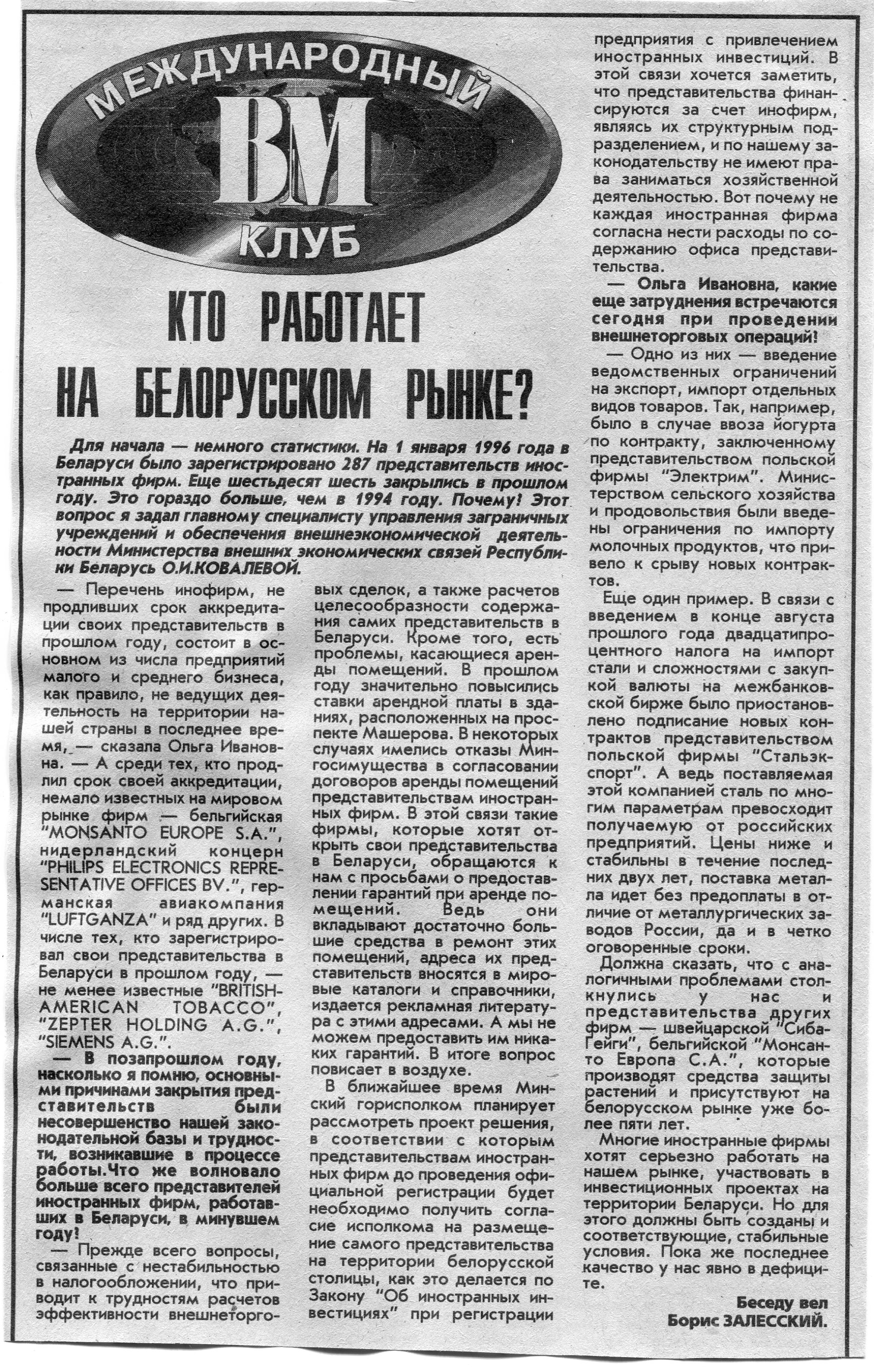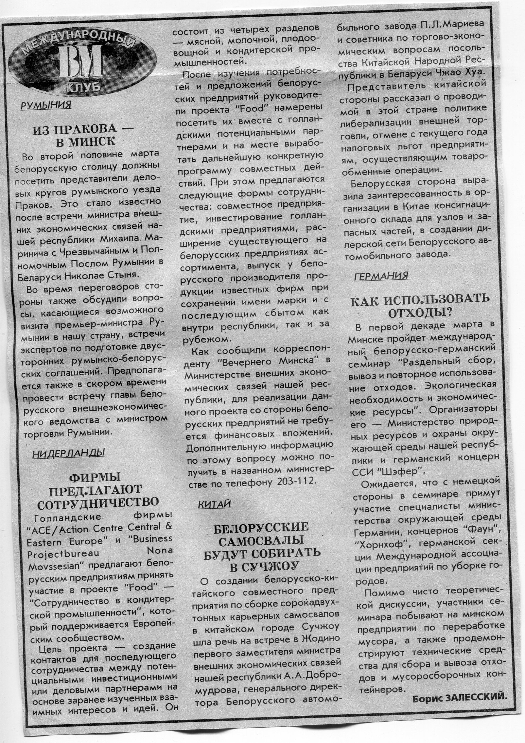 Залесский, Б. Международный клуб "ВМ" / Б. Залесский // Вечерний Минск. - 1996. - 29 февр.