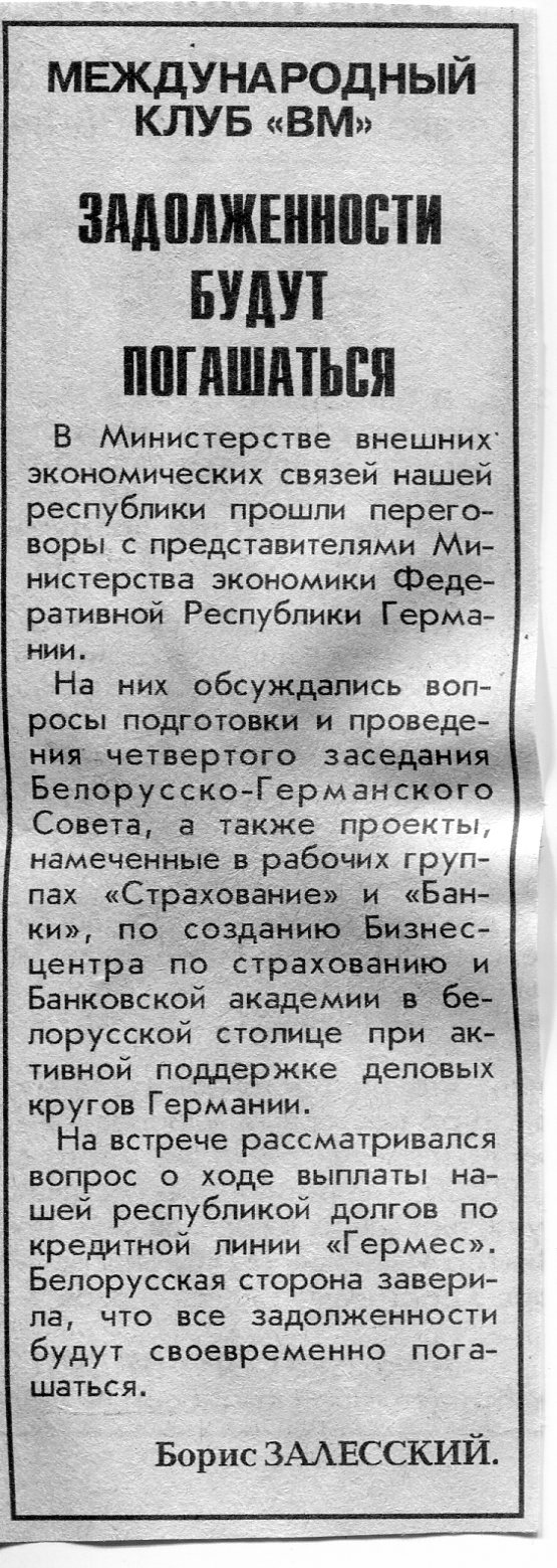 Залесский, Б. Задолженности будут погашаться / Б. Залесский // Вечерний Минск. - 1995. - 8 дек.