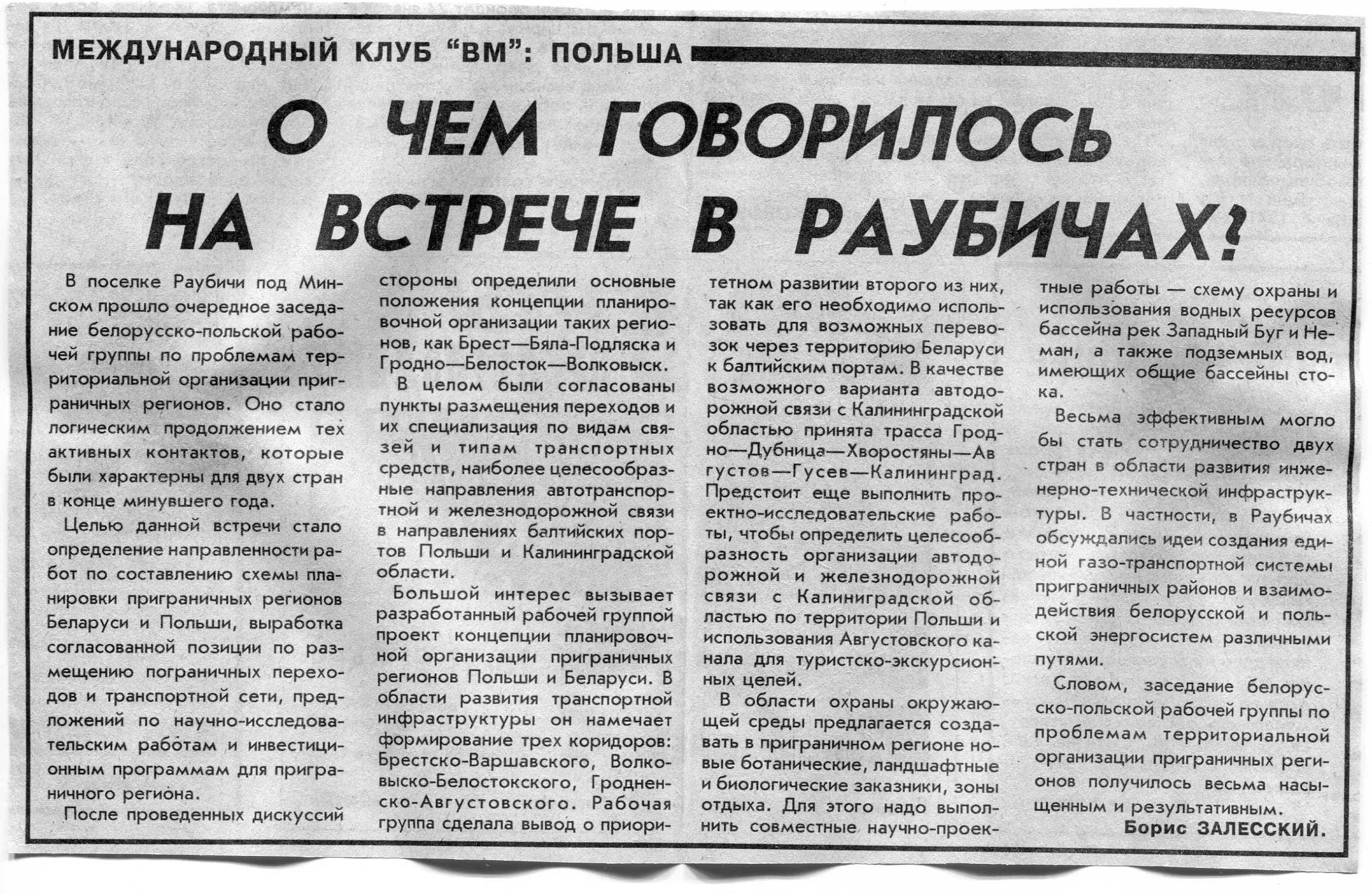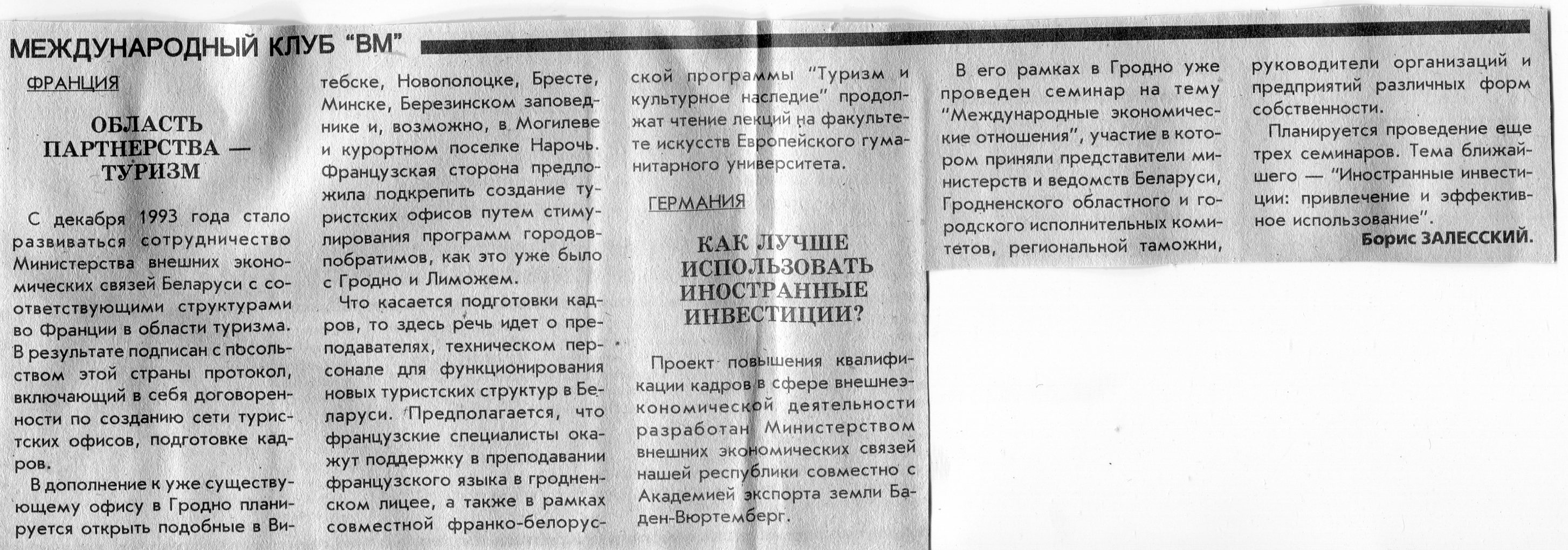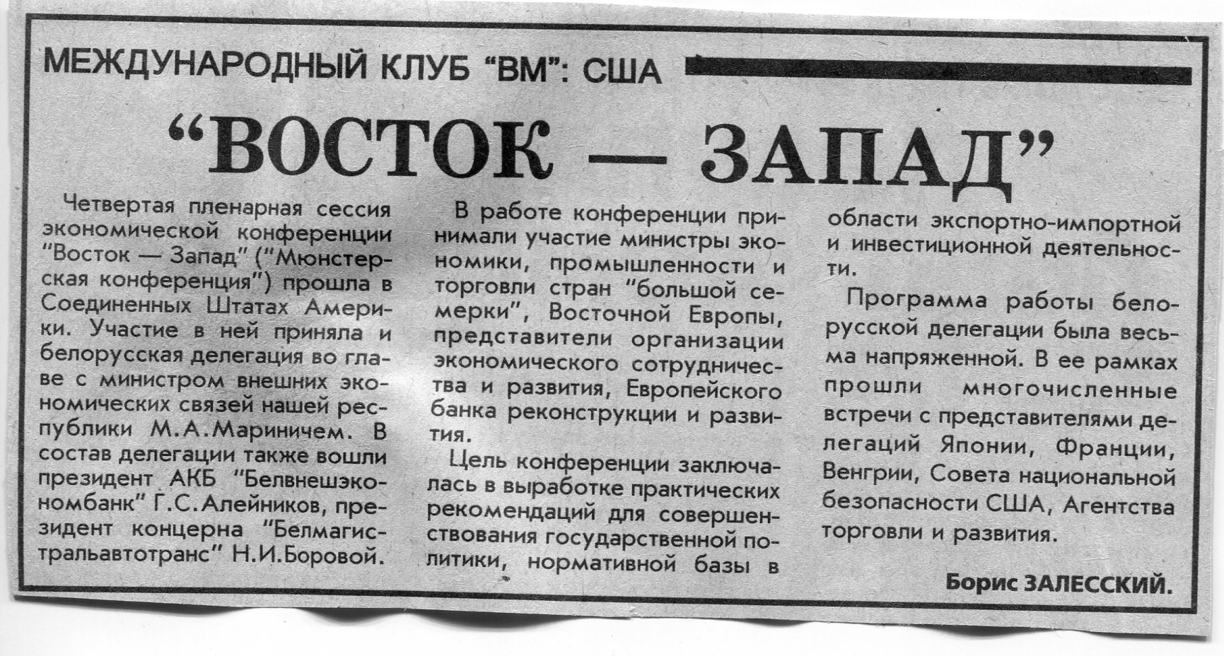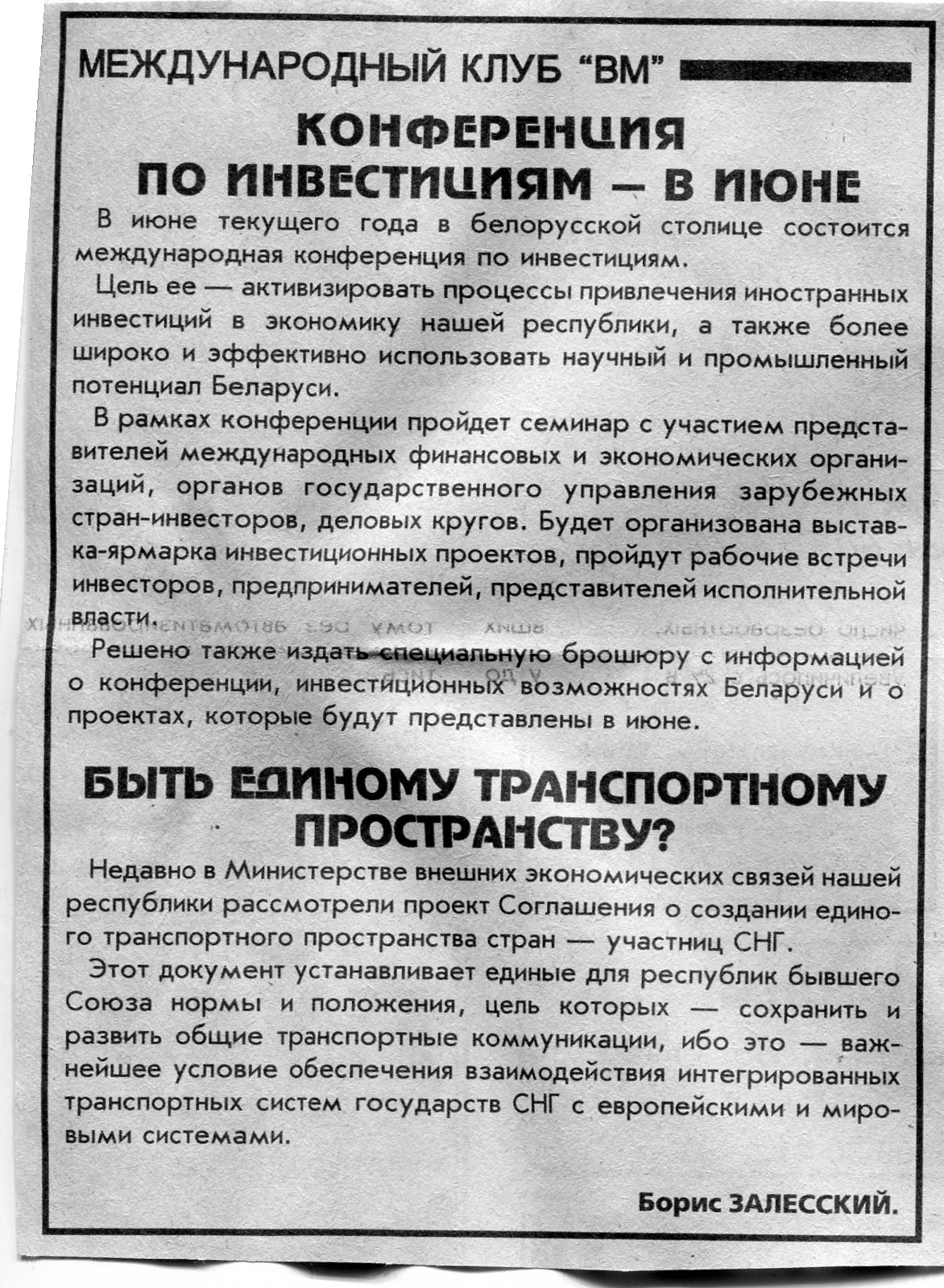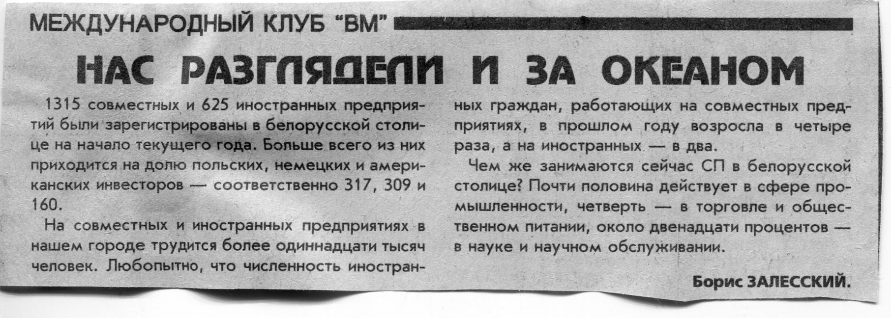 Залесский, Б. Международный клуб "ВМ" / Б. Залесский // Вечерний Минск. - 1996. - 13 мар.