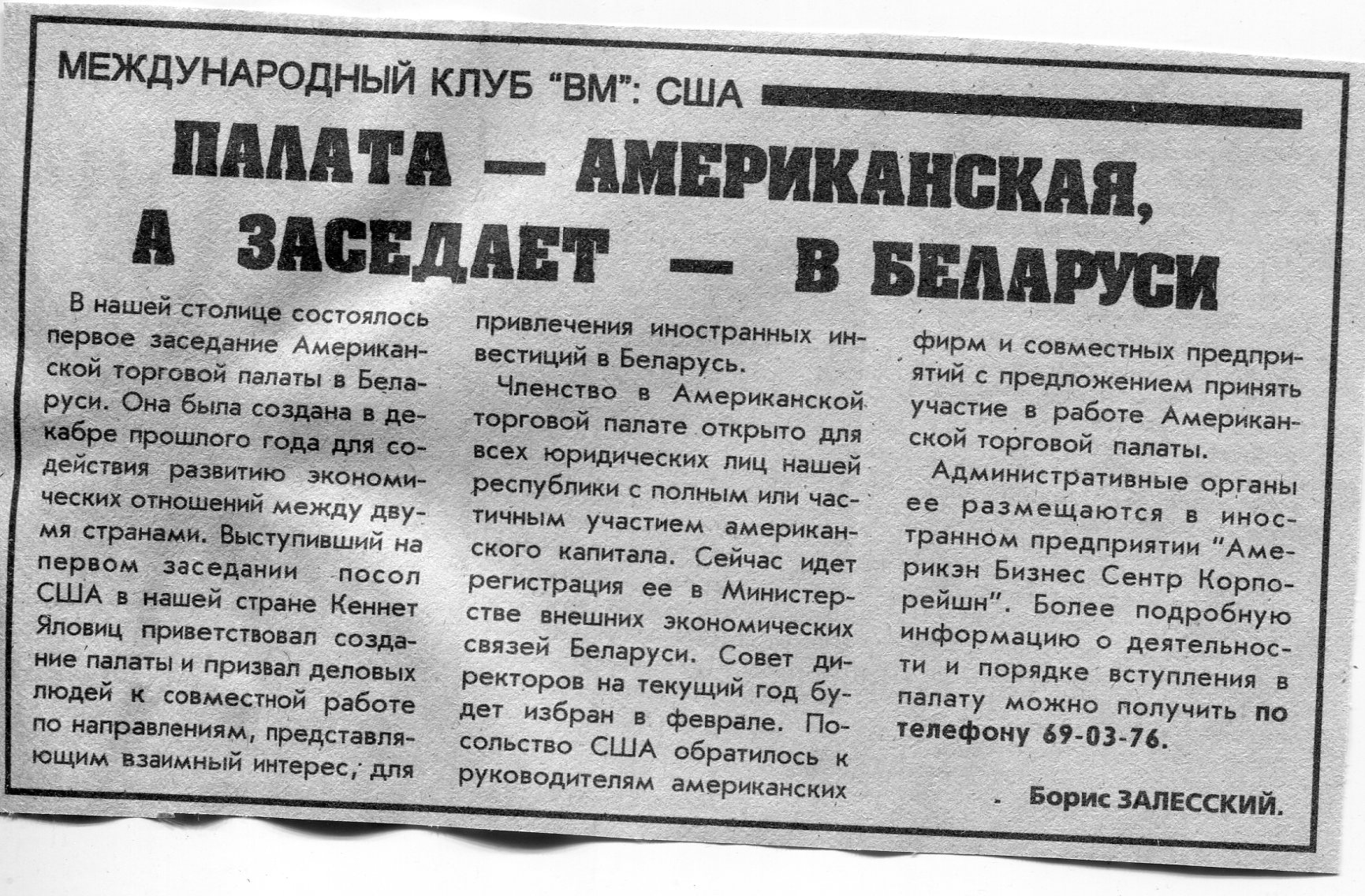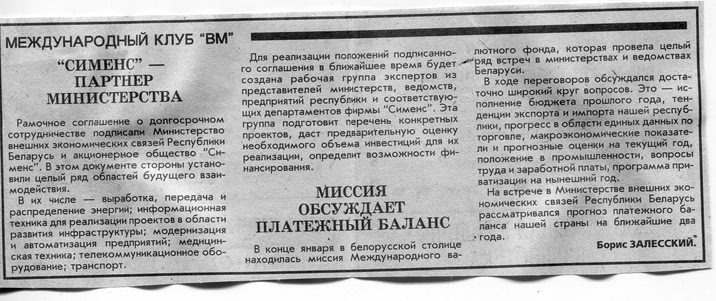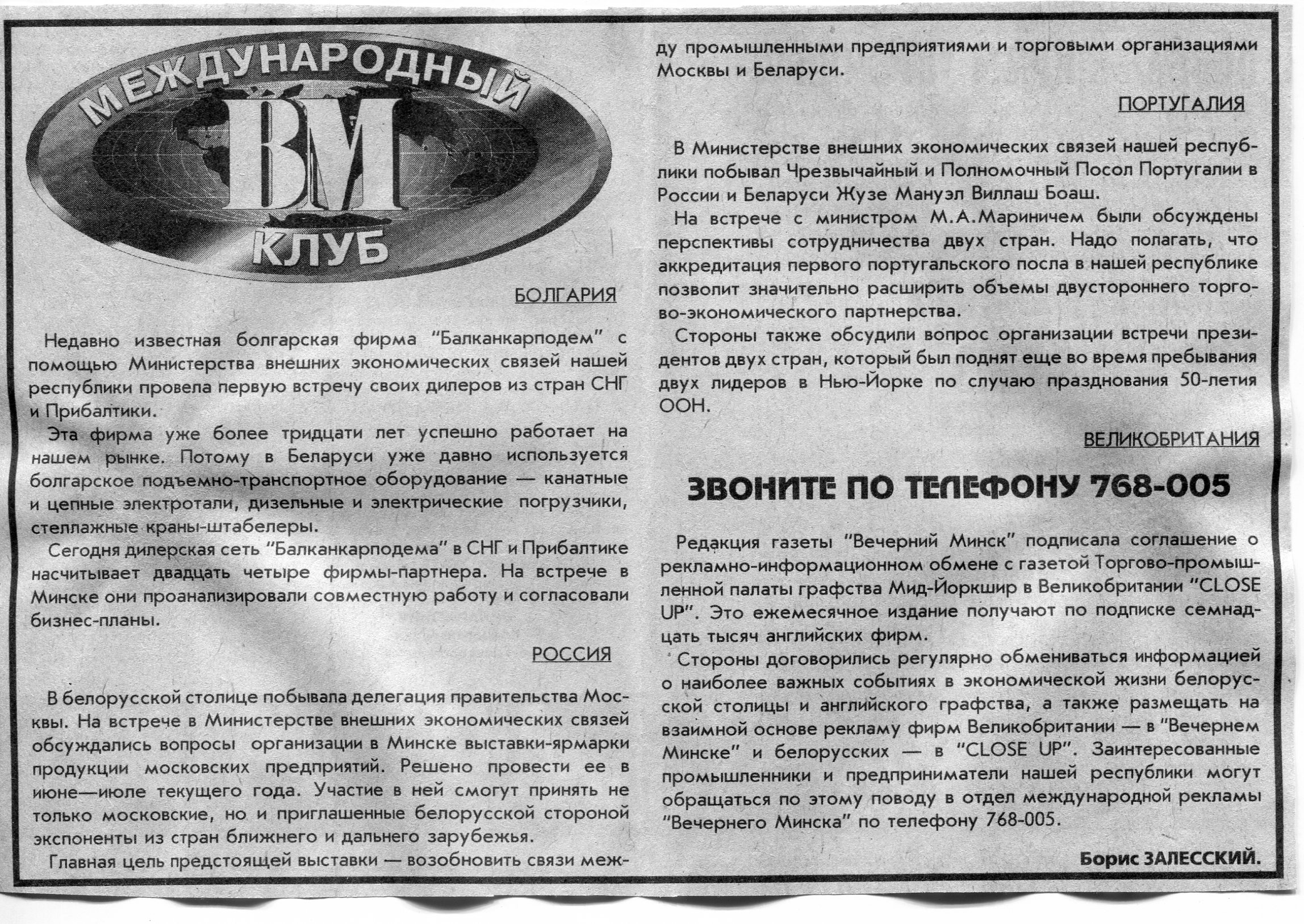 Залесский, Б. Международный клуб "ВМ" / Б. Залесский // Вечерний Минск. - 1995. - 22 дек.