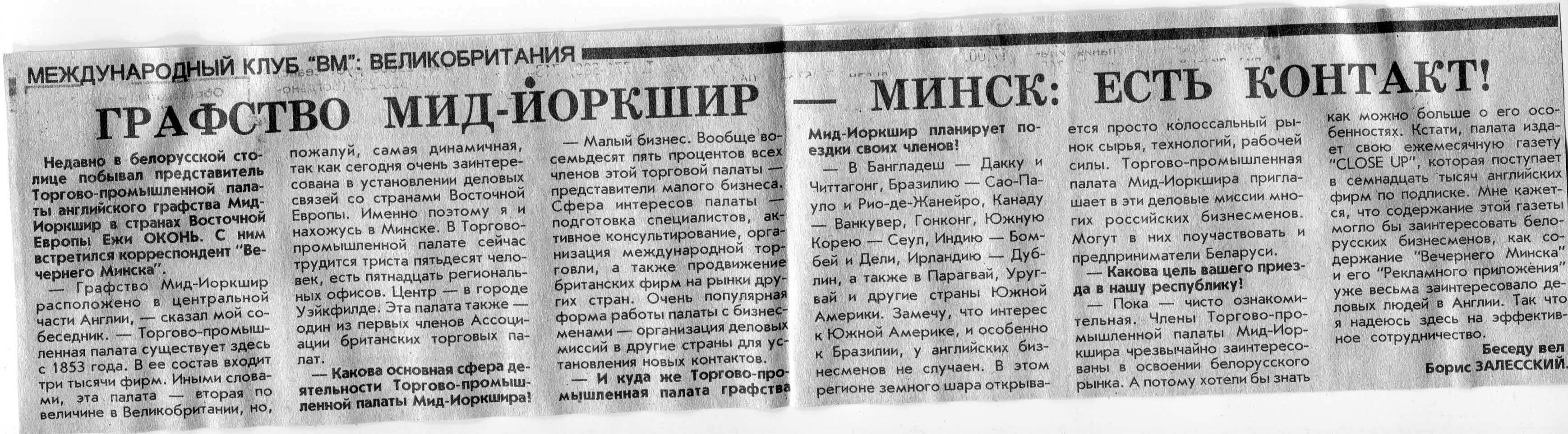 Залесский, Б. Графство Мид-Йоркшир - Минск: есть контакт! / Б. Залесский // Вечерний Минск. - 1996. - 6 мар.