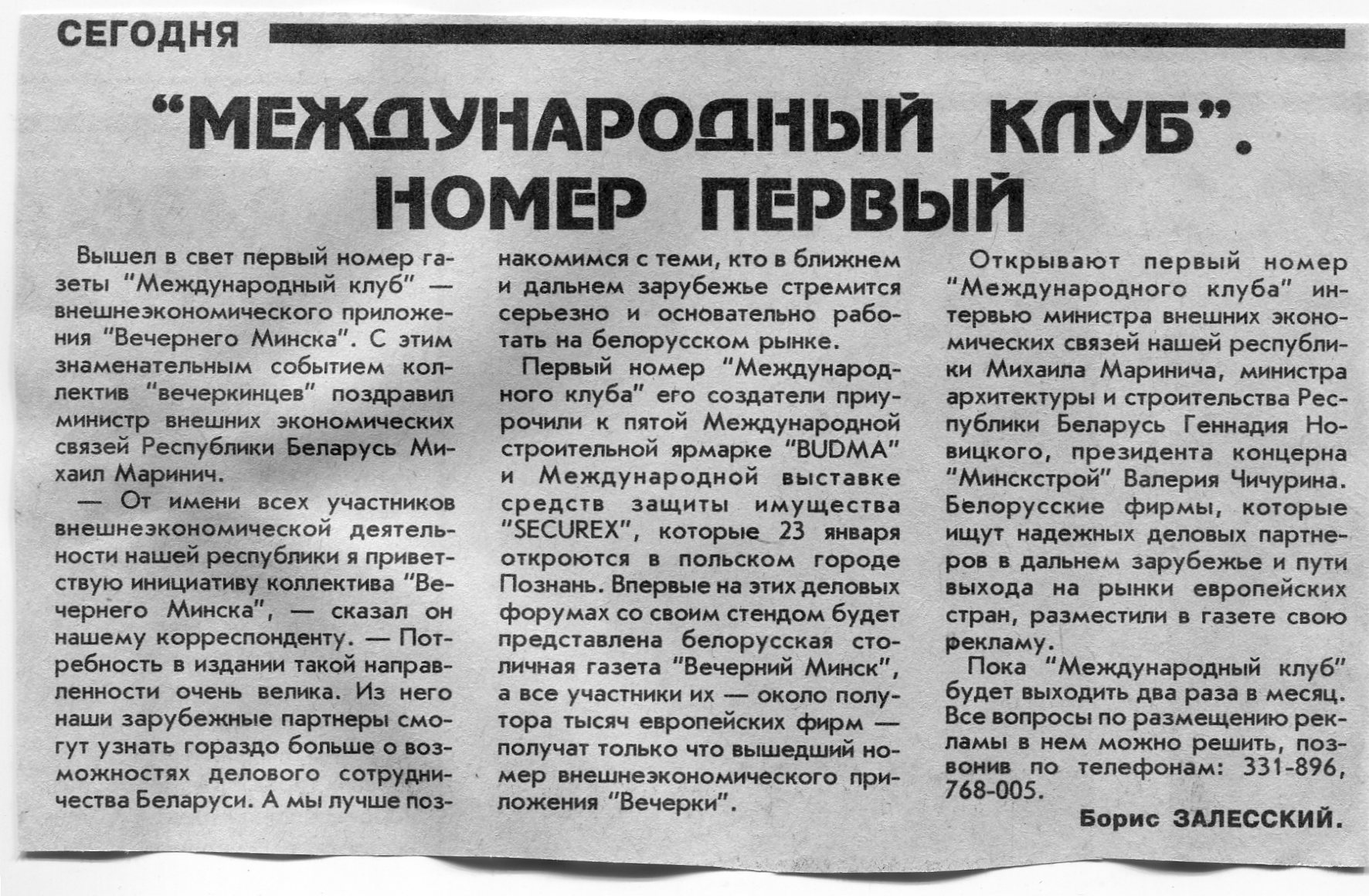 Залесский, Б. "Международный клуб". Номер первый / Б. Залесский // Вечерний Минск. - 1996. - 19 янв.