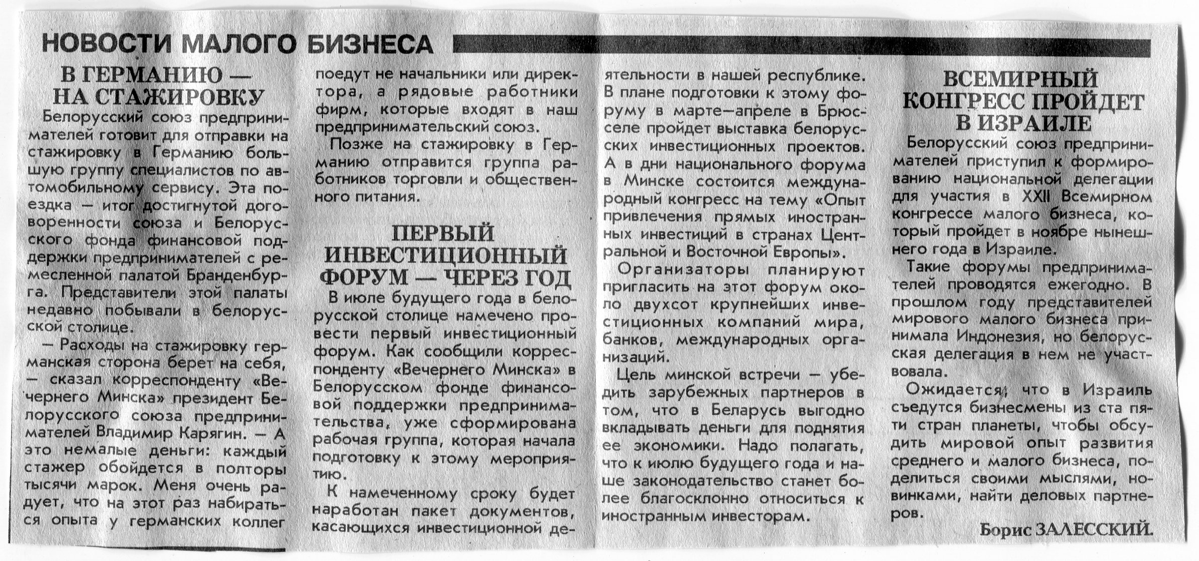 Залесский, Б. Новости малого бизнеса / Б. Залесский // Вечерний Минск. - 1995.- 28 июл.