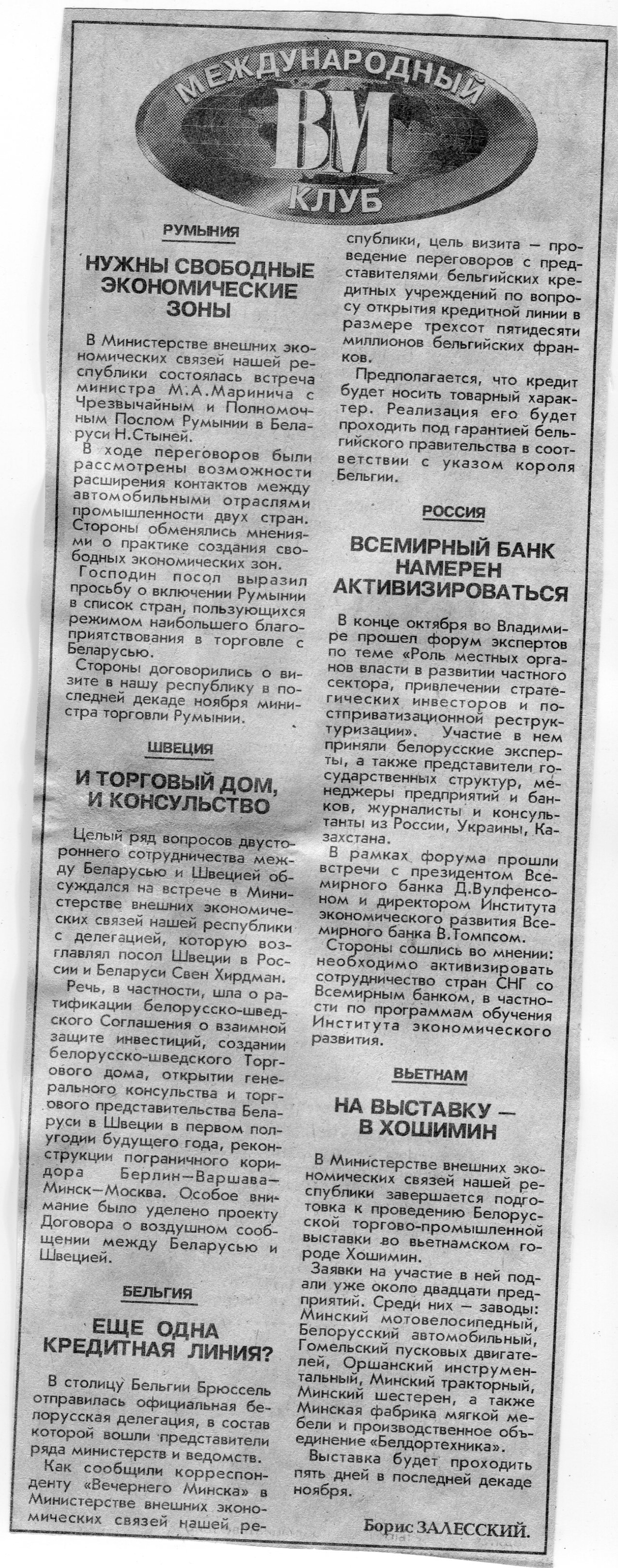 Залесский, Б. Международный клуб "ВМ" / Б. Залесский // Вечерний Минск. - 1995. - 2 окт.