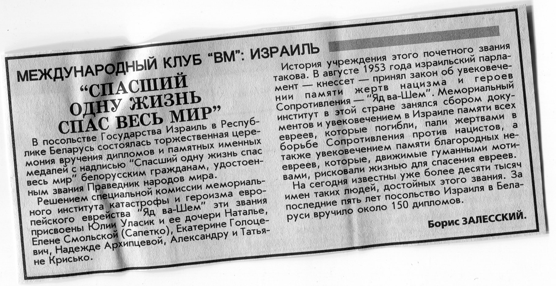 Залесский, Б. "Спасший одну жизнь спас весь мир" / Б. Залесский // Вечерний Минск. - 1998. - 24 июн.