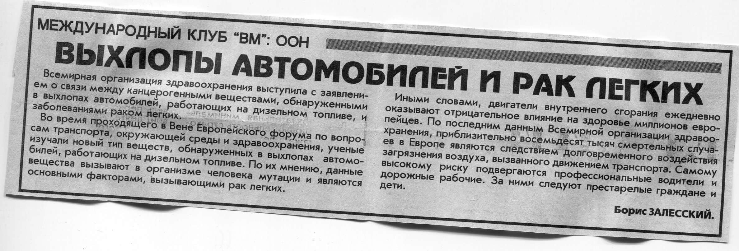 Залесский, Б. Выхлопы автомобилей и рак легких / Б. Залесский // Вечерний Минск. - 1998. - 4 сент.