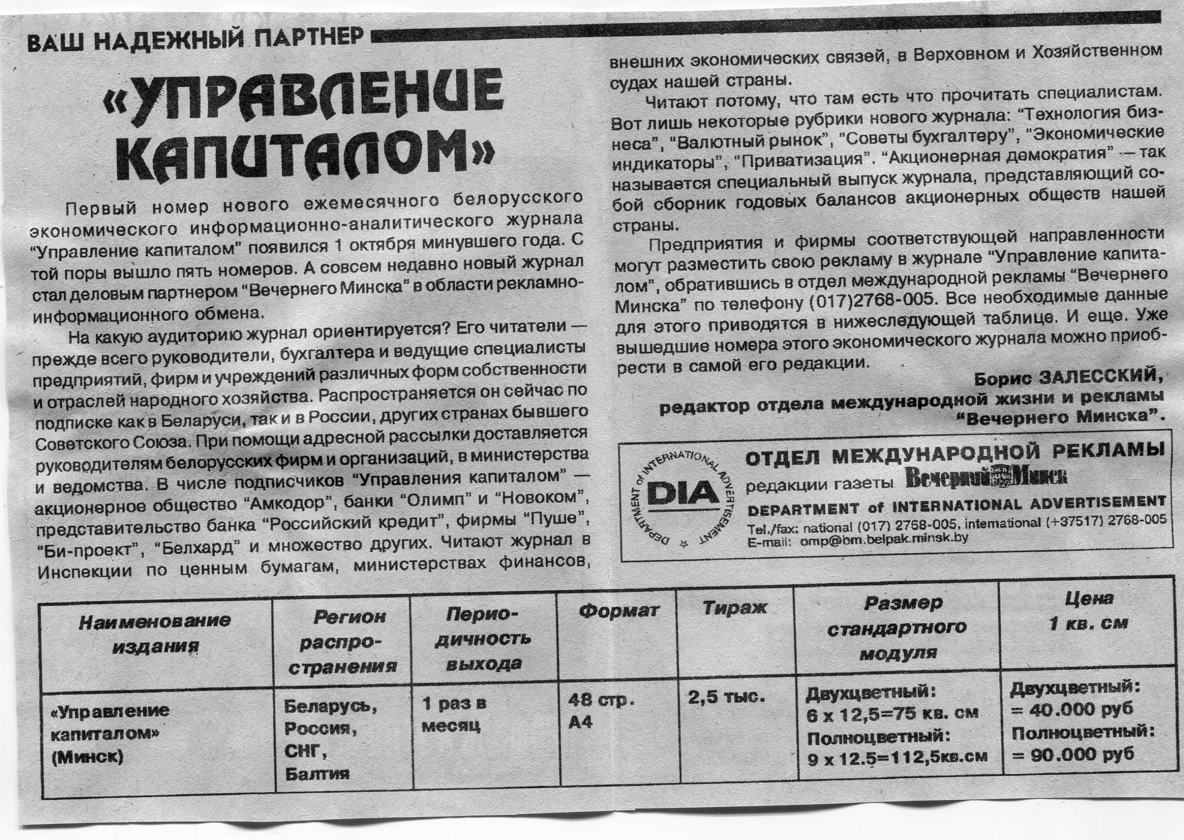 Залесский, Б. "Управление капиталом" / Б. Залесский // Вечерний Минск. - 1997. - 28 мар.