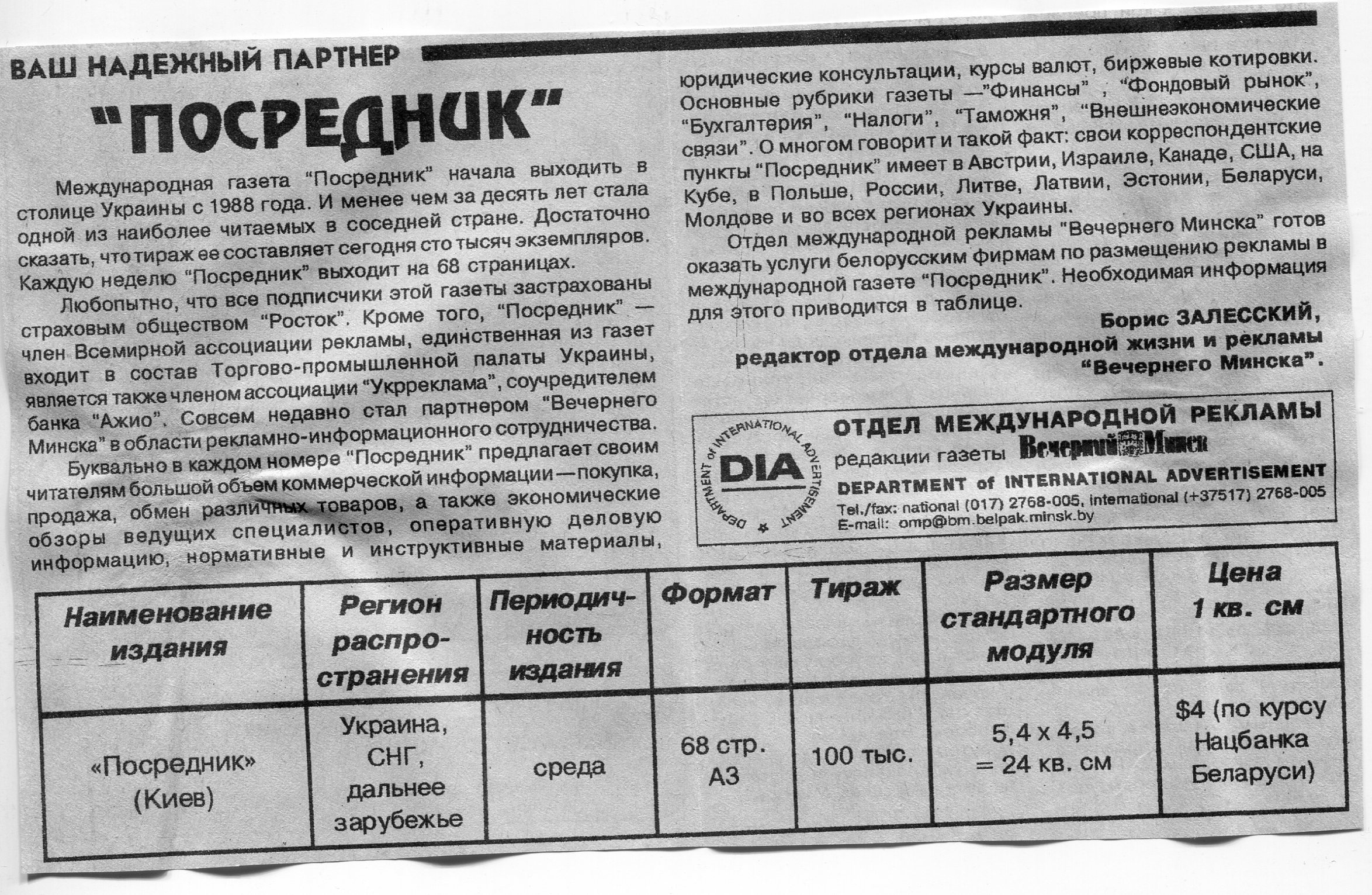 Залесский, Б. "Посредник" / Б. Залесский // Вечерний Минск. - 1997. - 19 мар.