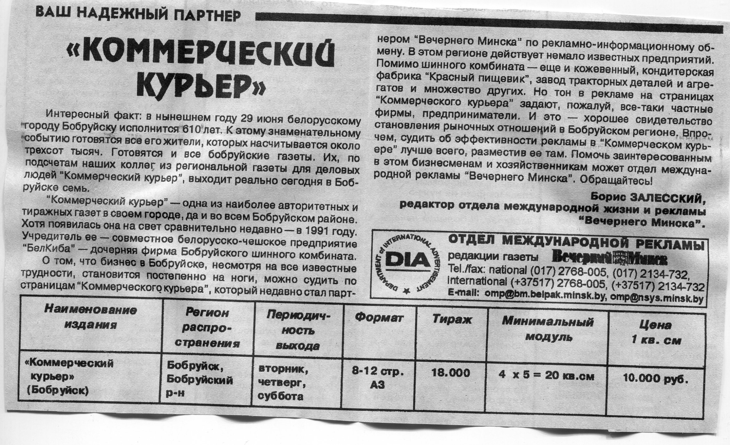 Залесский, Б. "Коммерческий курьер" / Б. Залесский // Вечерний Минск. - 1997. - 1 июл.