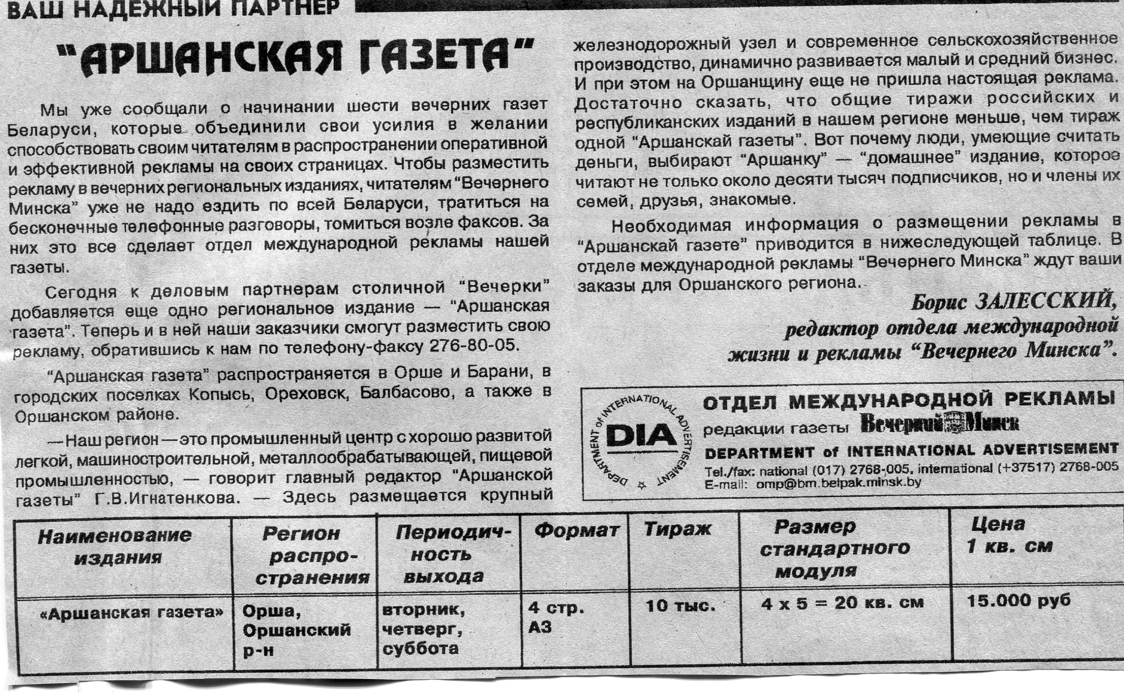 Залесский, Б. "Аршанская газета" / Б. Залесский // Вечерний Минск. - 1997. - 10 мар.