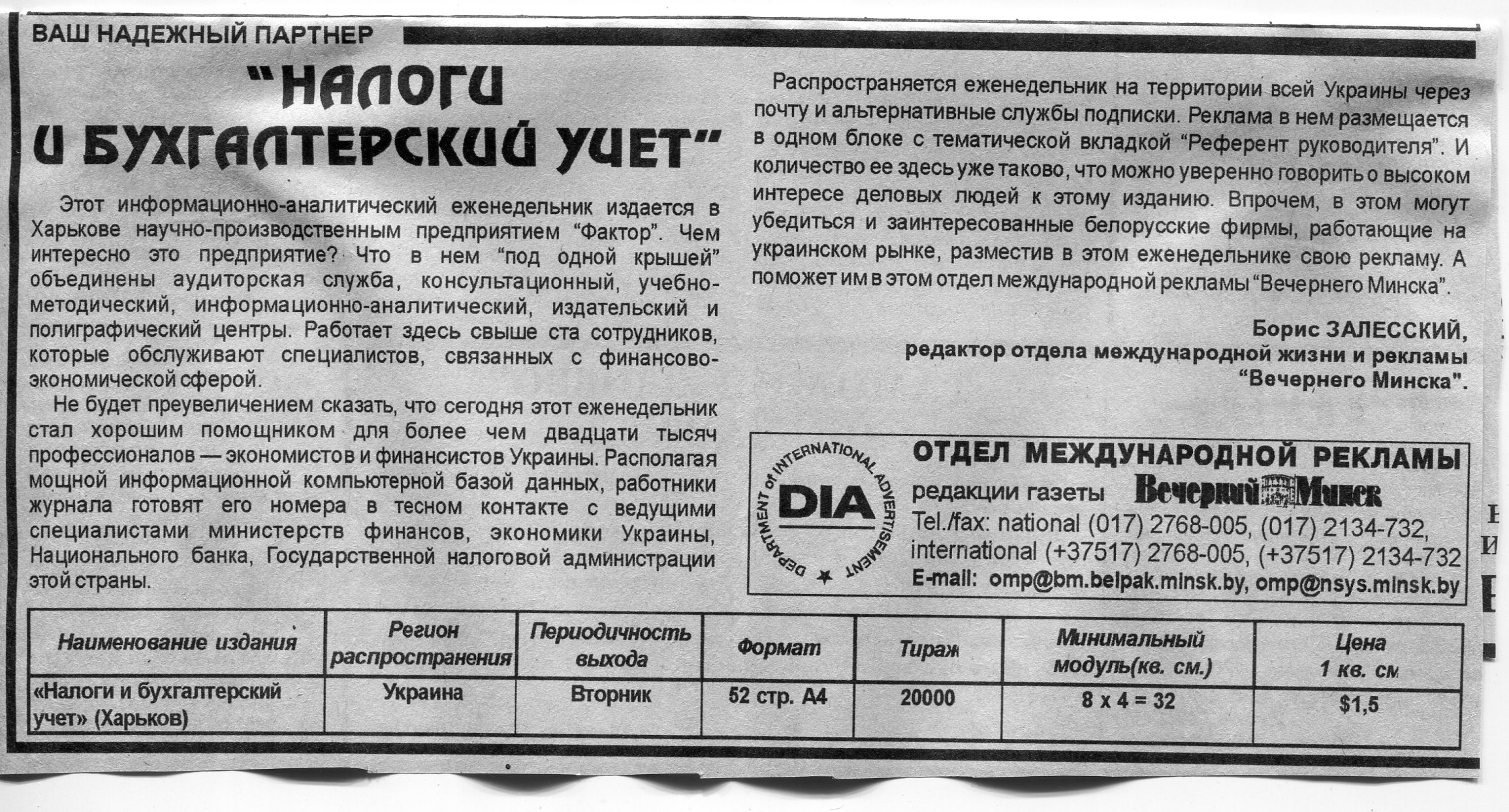 Залесский, Б. "Налоги и бухгалтерский учет" / Б. Залесский // Вечерний Минск. - 1997. - 4 сент.
