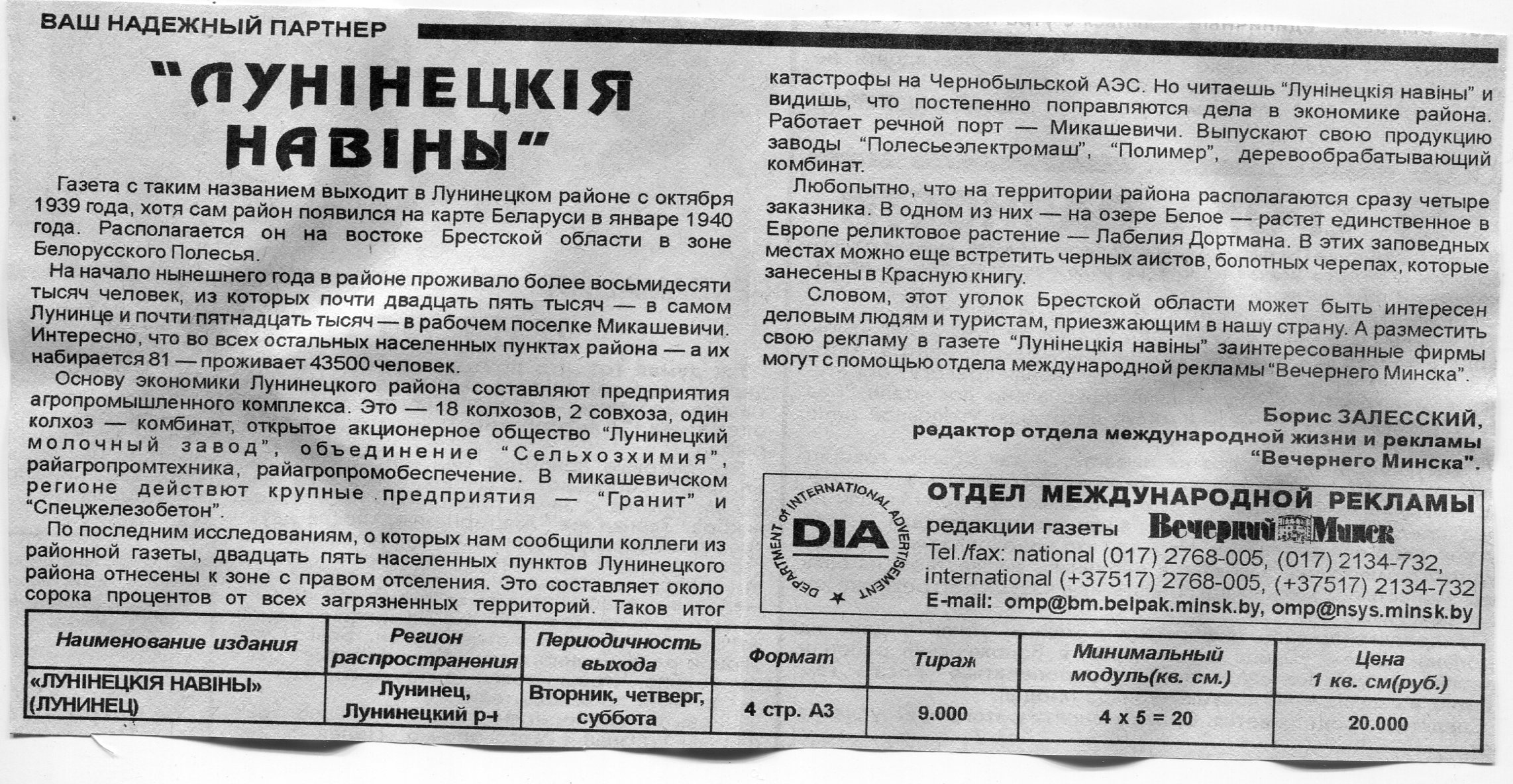 Залесский, Б. "Лунінецкія навіны" / Б. Залесский // Вечерний Минск. - 1997. - 25 сент.