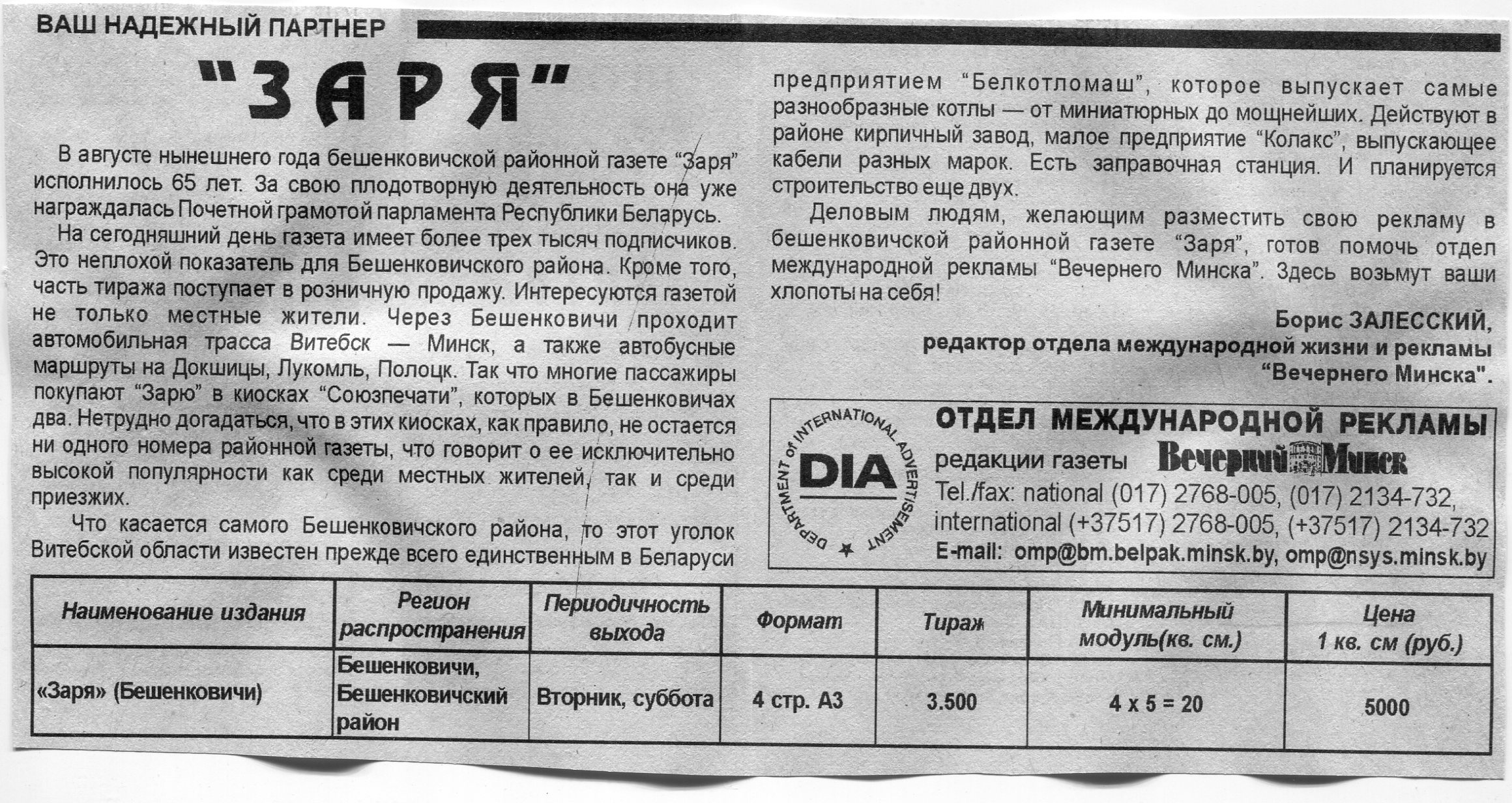 Залесский, Б. "Свіслацкая газета" / Б. Залесский // Вечерний Минск. - 1997. - 12 нояб.