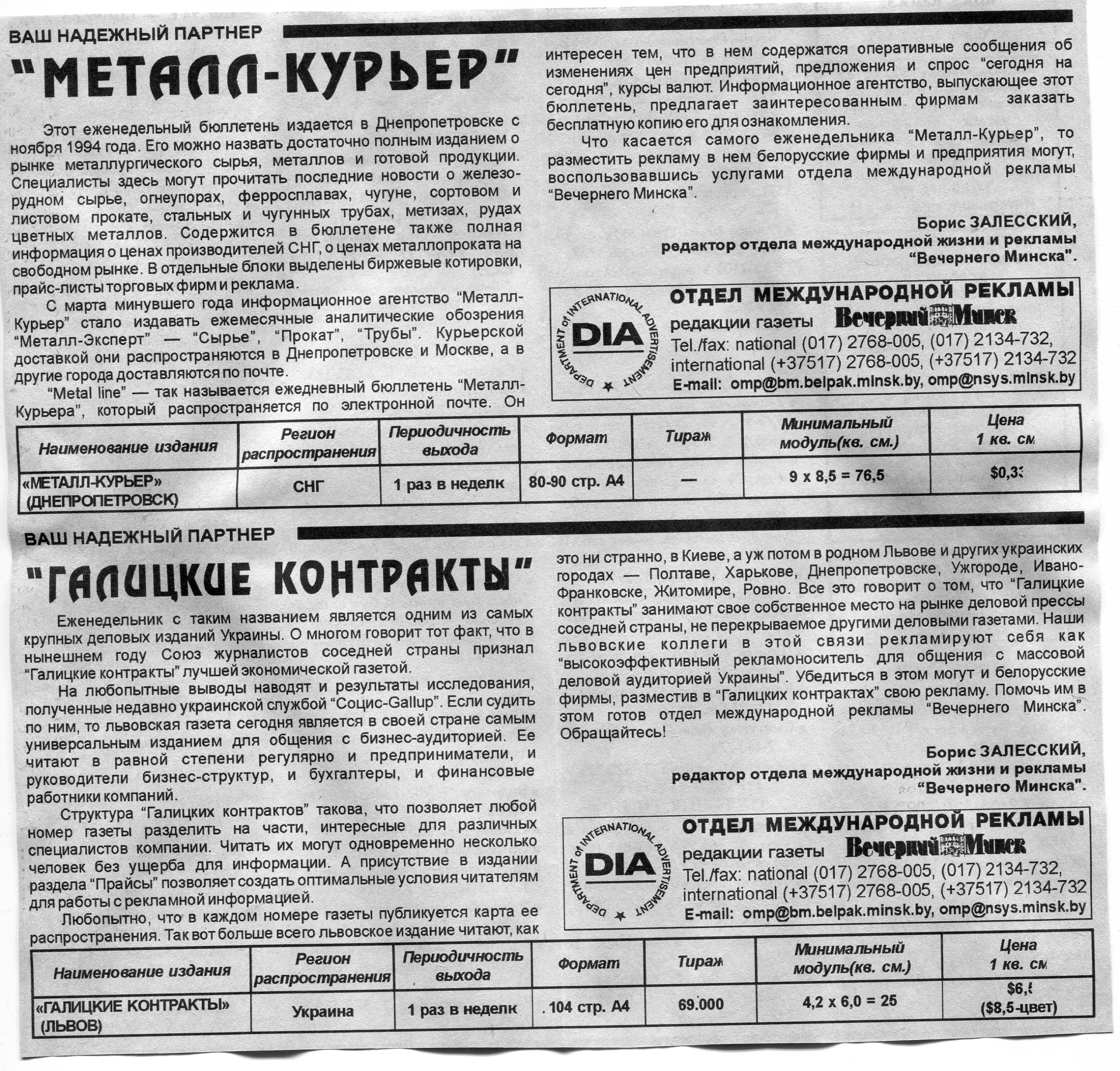 Залесский, Б. "Металл-курьер" / Б. Залесский // Вечерний Минск. - 1997. - 5 нояб.