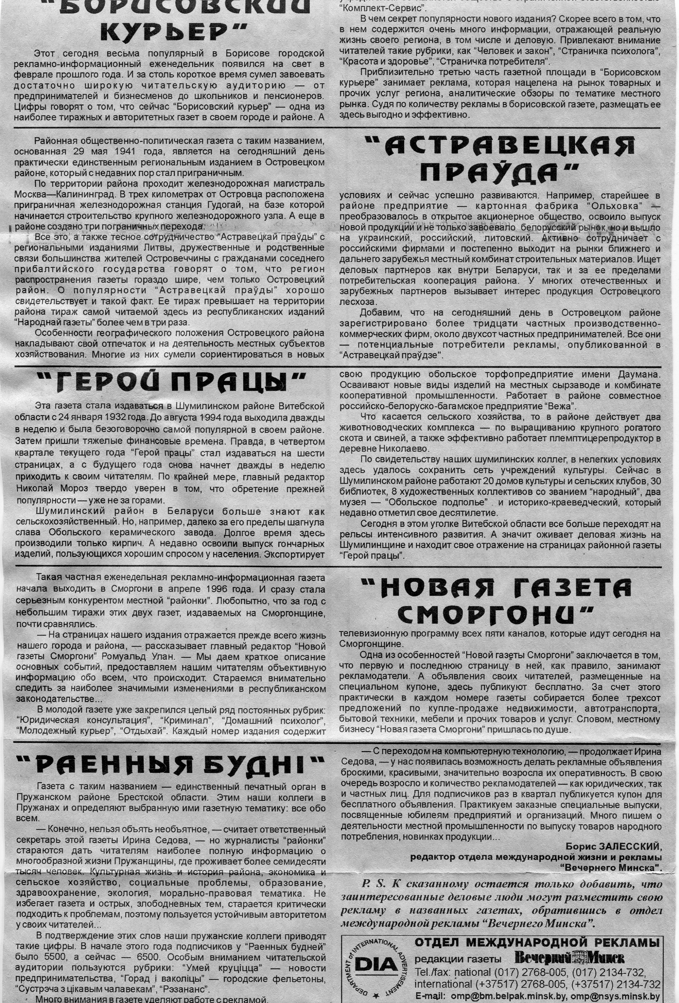 Залесский, Б. Районные и областные газеты Беларуси / Б. Залесский // Вечерний Минск. - 1997. - 15 окт.