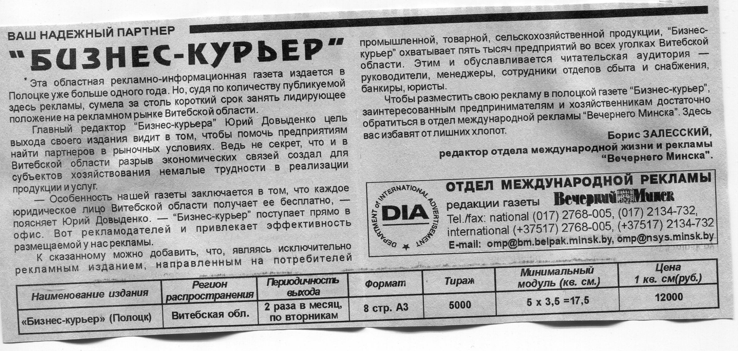 Залесский, Б. "Бизнес-курьер" / Б. Залесский // Вечерний Минск. – 1997. – 20 нояб.