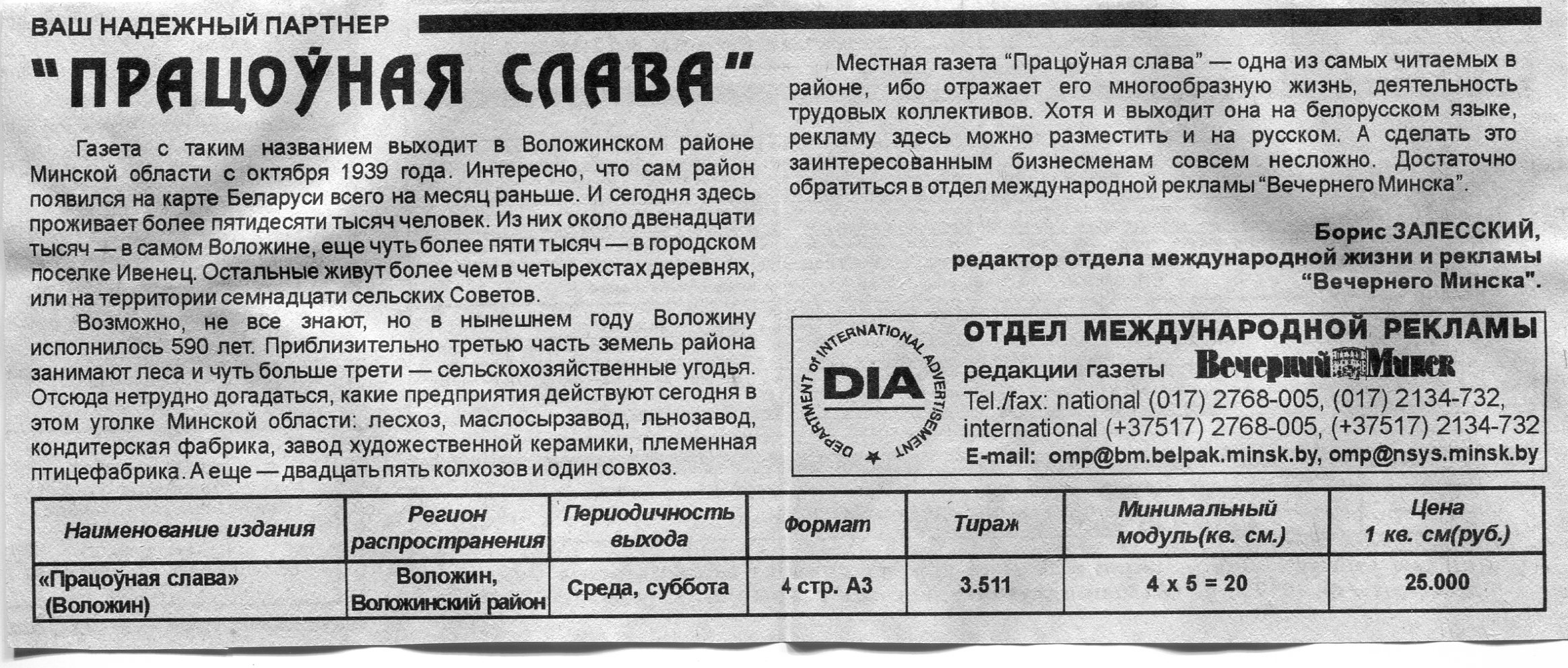 Залесский, Б. "Працоўная слава" / Б. Залесский // Вечерний Минск. - 1997. - 29 окт.