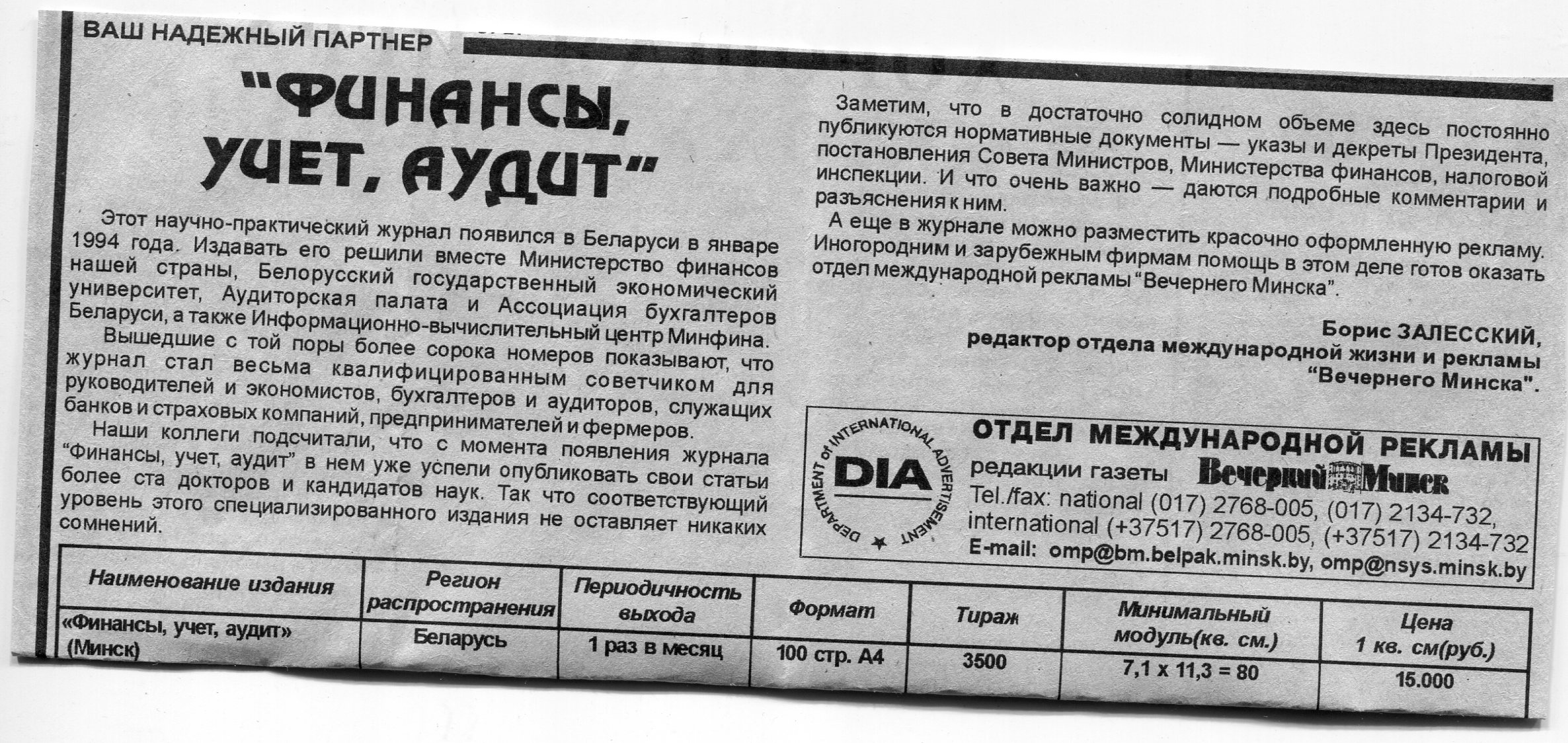 Залесский, Б. "Финансы, учет, аудит" / Б. Залесский // Вечерний Минск. - 1997. - 4 сент.