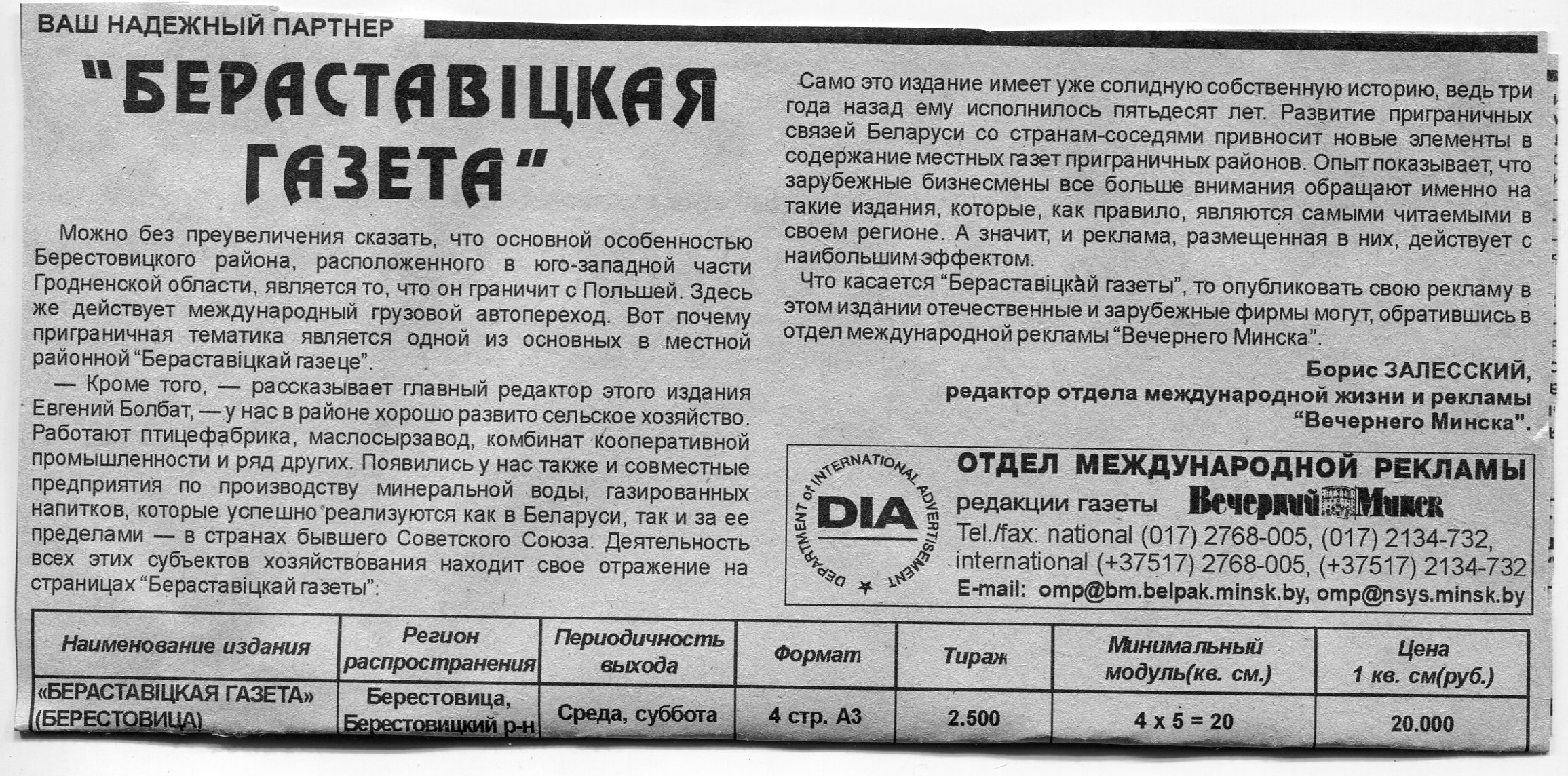 Залесский, Б. "Бераставіцкая газета" / Б. Залесский // Вечерний Минск. - 1997. - 2 окт.