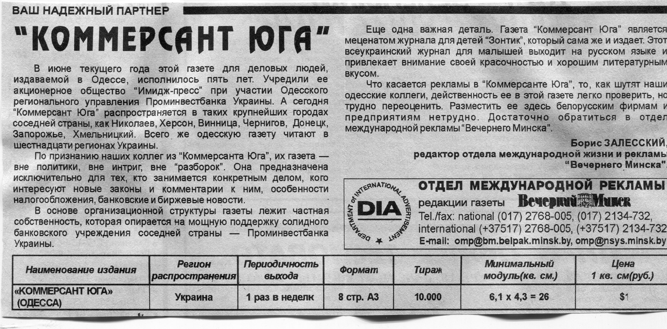 Залесский, Б. "Коммерсант Юга" / Б. Залесский // Вечерний Минск. – 1997. – 17 нояб.