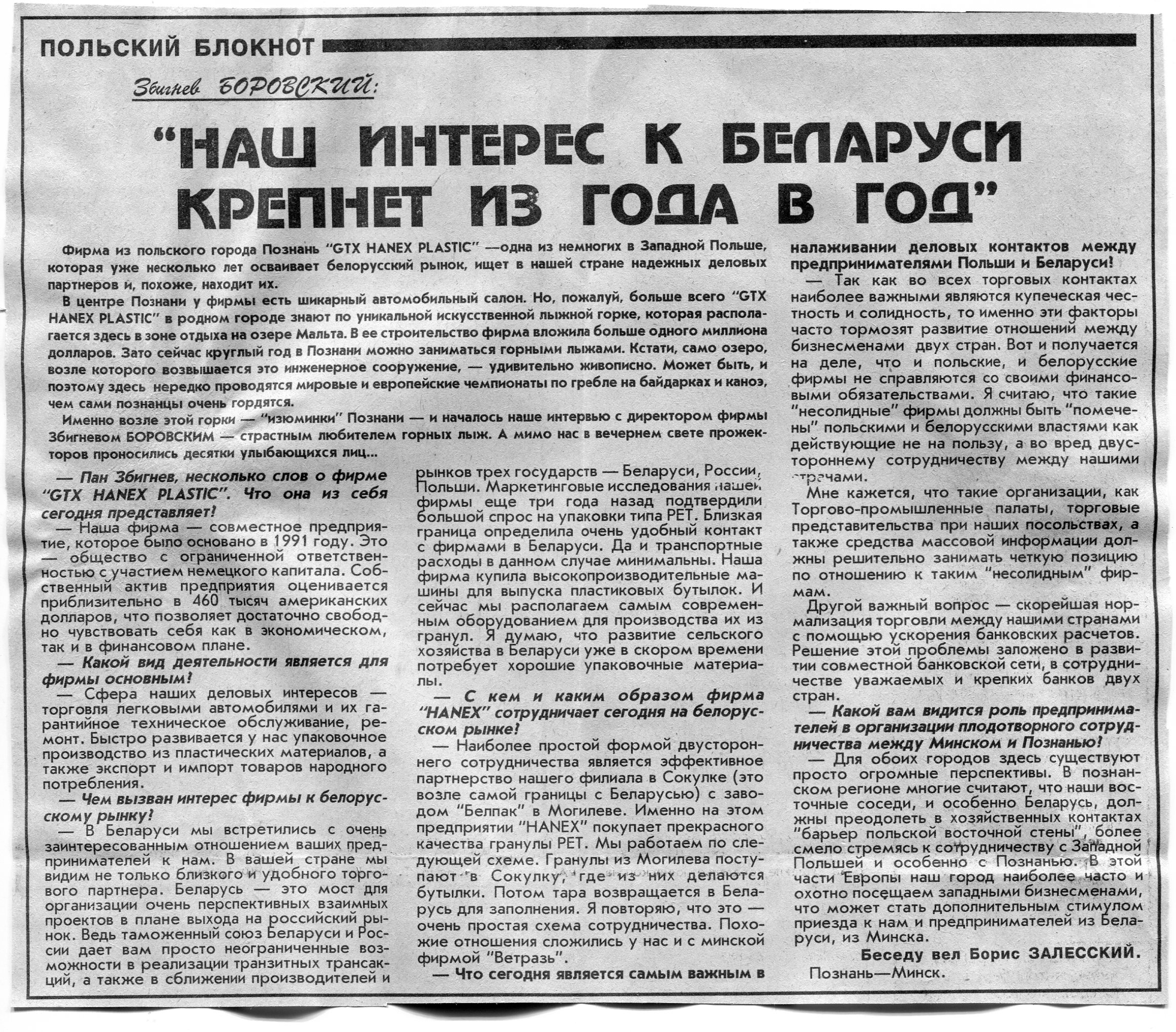 Залесский, Б. Збигнев Боровский: "Наш интерес к Беларуси крепнет из года в год" / Б. Залесский // Вечерний Минск. - 1996. - 12 янв.